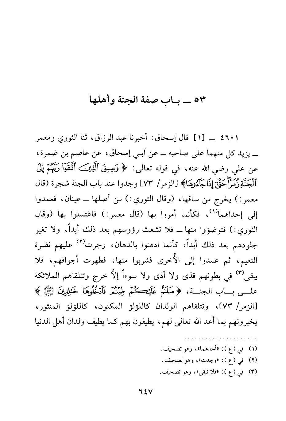 4601 -[1] قال إسحاق: أخبرنا عَبْدُ الرَّزَّاقِ، ثنا الثَّوْرِيُّ وَمَعْمَرٌ - يَزِيدُ كُلُّ مِنْهُمَا عَلَى صَاحِبِهِ - عَنْ أَبِي إِسْحَاقَ، عَنْ عَاصِمِ بْنِ ضَمْرَةَ، عَنْ عَلِيٍّ رَضِيَ الله عَنْه، فِي قَوْلِهِ تَعَالَى: {§وَسِيقَ الَّذِينَ اتَّقَوْا رَبَّهُمْ إِلَى الْجَنَّةِ زُمَرًا حَتَّى إِذَا جَآءُوهَا} [الزمر / 73] وَجَدُوا عِنْدَ بَابِ الْجَنَّةِ شَجَرَةً (قَالَ مَعْمَرٌ:) يَخْرُجُ مِنْ سَاقِهَا، (وَقَالَ الثَّوْرِيُّ:) مِنْ أَصْلِهَا - عَيْنَانِ، فَعَمَدُوا إِلَى إِحْدَاهُمَا، فَكَأَنَّمَا أُمِرُوا بِهَا (قَالَ مَعْمَرٌ: فَاغْتَسَلُوا بِهَا (وَقَالَ الثَّوْرِيُّ:) فتوضؤوا مِنْهَا - فَلَا تُشْعَثُ رؤوسهم بَعْدَ ذَلِكَ أَبَدًا، وَلَا تُغَيَّرُ جُلُودُهُمْ بَعْدَ ذَلِكَ أَبَدًا، كَأَنَّمَا ادَّهَنُوا بِالدِّهَانِ، وَجَرَتْ عَلَيْهِمْ نَضْرَةُ النَّعِيمِ، ثُمَّ عَمَدُوا إِلَى الْأُخْرَى فَشَرِبُوا مِنْهَا، فَطَهَّرَتْ أَجْوَافَهُمْ، فَلَا يَبْقَى فِي بُطُونِهِمْ قَذًى وَلَا أذى ولا سوءاً إِلَّا خَرَجَ وَتَتَلَقَّاهُمُ الْمَلَائِكَةُ عَلَى بَابِ الْجَنَّةِ، {سَلَامٌ عَلَيْكُمْ طِبْتُمْ فَادْخُلُوهَا خَالِدِينَ (73) } [الزمر / 73] ، وَتَتَلَقَّاهُمُ الْوِلْدَانُ كَاللُّؤْلُؤِ الْمَكْنُونِ، كاللؤلؤ الْمَنْثُورِ، يُخْبِرُونَهُمْ بِمَا أعد الله تعالى لَهُمْ، يُطِيفُونَ بِهِمْ كَمَا يطيف وِلْدَانُ أَهْلِ الدُّنْيَا