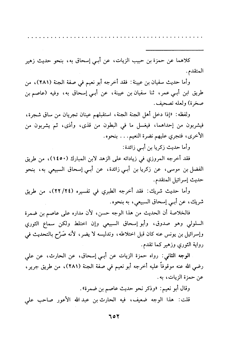 الوجه الثاني: رواه حمزة الزيات عَنْ أَبِي إِسْحَاقَ، عَنِ الْحَارِثِ، عَنْ عَلِيٍّ رضي الله عنه موقوفًا عليه أخرجه أبو نعيم في صفة الجنة (281)، من طريق جرير، عن حمزة الزيات، به.