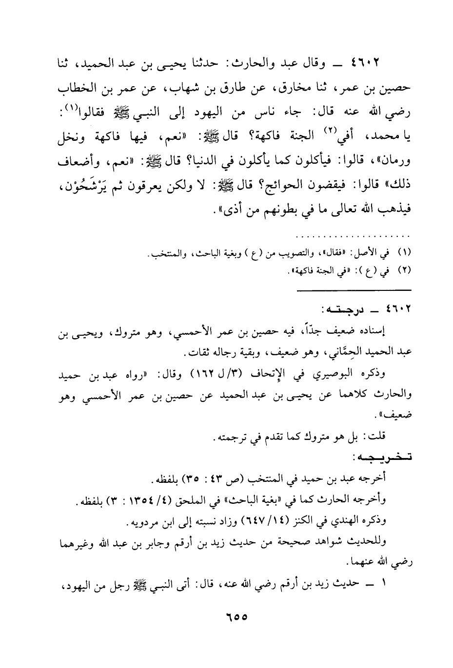 4602 - وَقَالَ عَبْدُ وَالْحَارِثُ: حَدَّثَنَا يَحْيَى بْنُ عَبْدِ الْحَمِيدِ، ثنا حُصَيْنُ بْنُ عُمَرَ، ثنا مُخَارِقٌ، عَنْ طَارِقِ بْنِ شِهَابٍ، عَنْ عُمَرَ بْنِ الْخَطَّابِ رَضِيَ الله عَنْه قَالَ: جَاءَ نَاسٌ مِنَ الْيَهُودِ إِلَى النَّبِيِّ صَلَّى اللَّهُ عَلَيْهِ وَسَلَّمَ فَقَالُوا: يَا مُحَمَّدُ، أَفِي الْجَنَّةِ فَاكِهَةٌ؟ قَالَ صَلَّى اللَّهُ عَلَيْهِ وَسَلَّمَ: " نَعَمْ، §فِيهَا فَاكِهَةٌ وَنَخْلٌ وَرُمَّانٌ "، قَالُوا: فَيَأْكُلُونَ كَمَا يَأْكُلُونَ فِي الدُّنْيَا؟ قَالَ صَلَّى اللَّهُ عَلَيْهِ وَسَلَّمَ: " نَعَمْ، وَأَضْعَافُ ذَلِكَ " قَالُوا: فَيَقْضُونَ الْحَوَائِجَ؟ قَالَ صَلَّى اللَّهُ عَلَيْهِ وَسَلَّمَ: لَا وَلَكِنْ يَعْرَقُونَ ثُمَّ يَرْشَحُونَ، فيذهب الله تعالى مَا فِي بُطُونِهِمْ مِنْ أَذًى ".