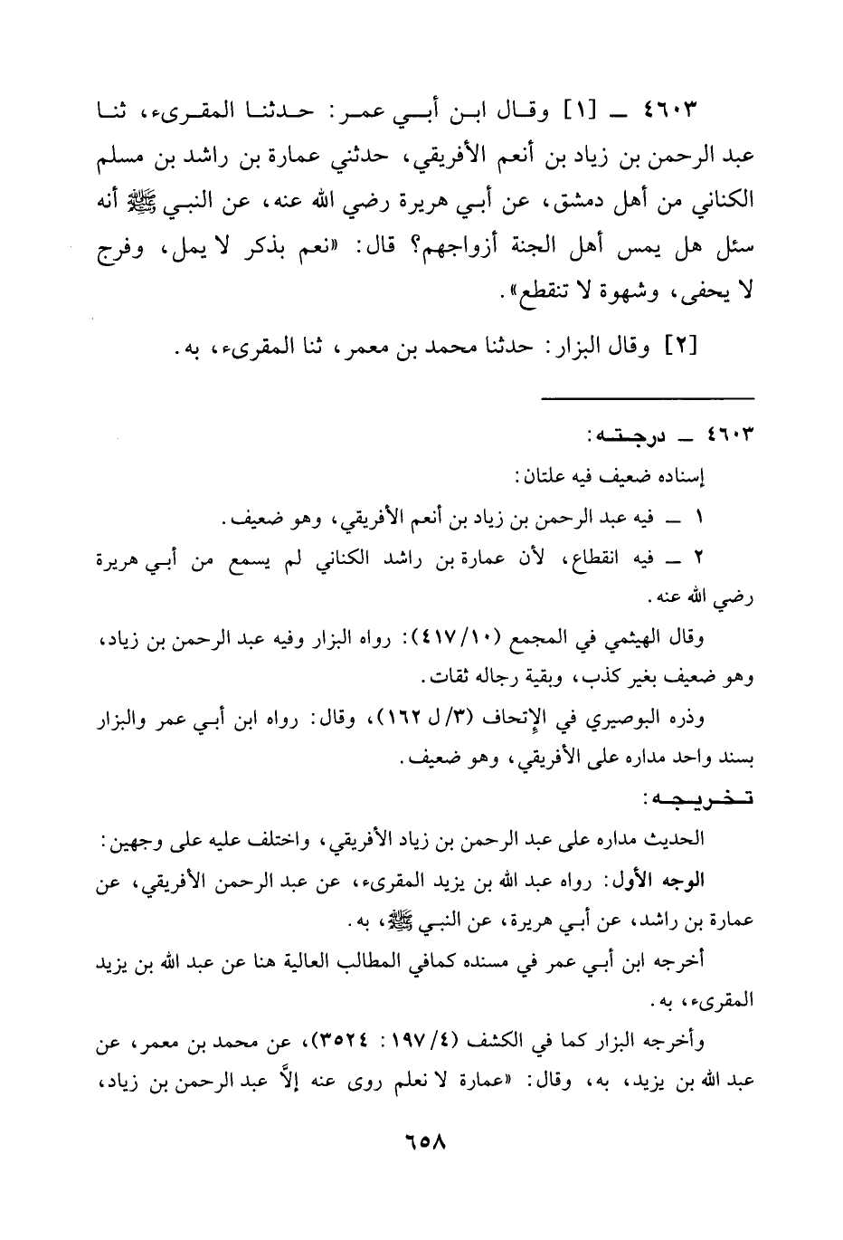 4603 -[1] وَقَالَ ابْنُ أَبِي عُمَرَ: حَدَّثَنَا الْمُقْرِئُ، ثنا عَبْدُ الرَّحْمَنِ بْنُ زِيَادِ بْنِ أَنْعَمَ الْإِفْرِيقِيُّ، حَدَّثَنِي عُمَارَةُ بْنُ رَاشِدِ بْنِ مُسْلِمٍ الْكِنَانِيُّ مِنْ أَهْلِ دِمَشْقَ، عَنْ أَبِي هُرَيْرَةَ رَضِيَ الله عَنْه، عَنِ النَّبِيِّ صَلَّى اللَّهُ عَلَيْهِ وَسَلَّمَ أَنَّهُ سُئِلَ §هَلْ يَمَسُّ أَهْلُ الْجَنَّةِ أَزْوَاجَهُمْ؟ قَالَ: " نَعَمْ بِذَكَرٍ لَا يَمَلُّ، وَفَرْجٍ لَا يُحْفَى، وَشَهْوَةٍ لَا تَنْقَطِعُ ".