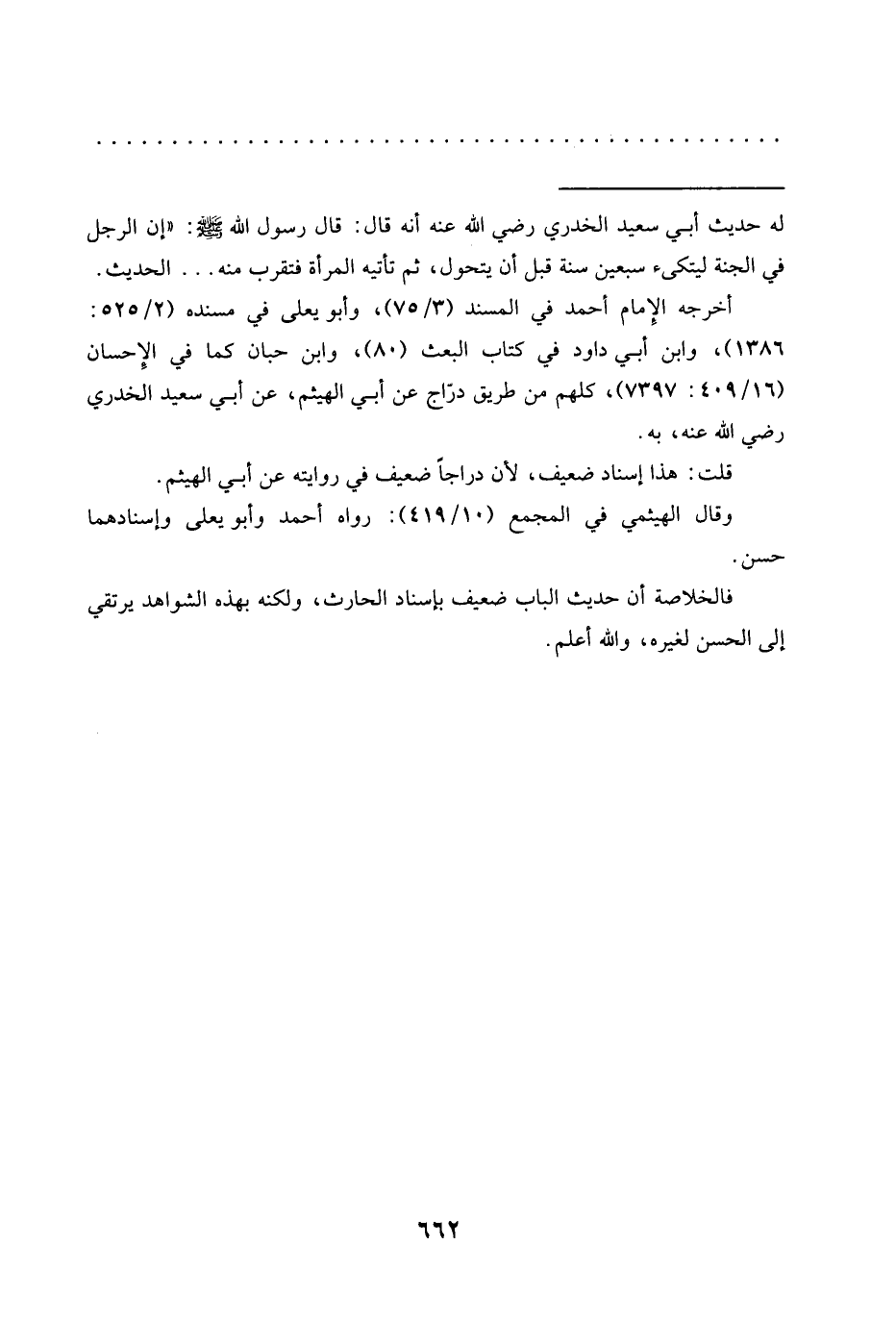 أخرجه الإِمام أحمد في المسند (3/ 75)، وأبو يعلى في مسنده (2/ 525: 1386)، وابن أبي داود في كتاب البعث (80)، وابن حبّان كما في الإِحسان (16/ 409: 7397)، كلهم من طريق دَرَّاجٍ عَنْ أَبِي الْهَيْثَمِ، عَنْ أَبِي سَعِيدٍ الخدري رضي الله عنه، به.