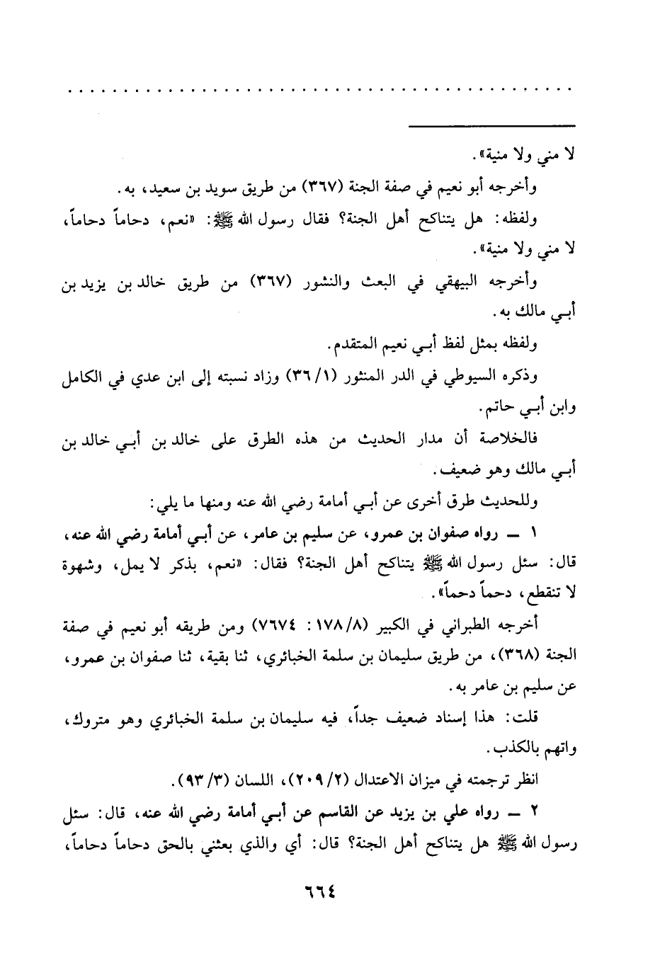 1 - رواه صفوان بن عمرو، عَنْ سُلَيْمِ بْنِ عَامِرٍ، عَنْ أَبِي أُمَامَةَ رضي الله عنه، قَالَ: سُئِلَ رَسُولُ اللَّهِ -صَلَّى اللَّهُ عَلَيْهِ وسلم- يتناكح أهل الجنة؟ فقال: "نعم، بذكر لا يمل، وشهوة لا تنقطع، دحمًا دحمًا".