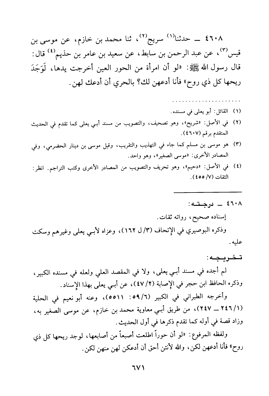 4608 - حَدَّثَنَا سُرَيْجٌ، ثنا مُحَمَّدُ بْنُ خَازِمٍ، عَنْ مُوسَى بْنِ قَيْسٍ، عَنْ عَبْدِ الرَّحْمَنِ بْنِ سَابِطٍ، عَنْ سَعِيدِ بْنِ عَامِرِ بْنِ حِذْيَمٍ قَالَ: قَالَ رَسُولُ اللَّهِ صَلَّى اللَّهُ عَلَيْهِ وَسَلَّمَ: " §لَوْ أَنَّ امْرَأَةً مِنَ الْحُورِ الْعِينِ أَخْرَجَتْ يَدَهَا، لَوَجَدَ رِيحَهَا كُلُّ ذِي رُوحٍ " فَأَنَا أَدَعُهُنَّ لَكَ؟ بِالْحَرِيِّ أَنْ أَدَعَكَ لَهُنَّ.