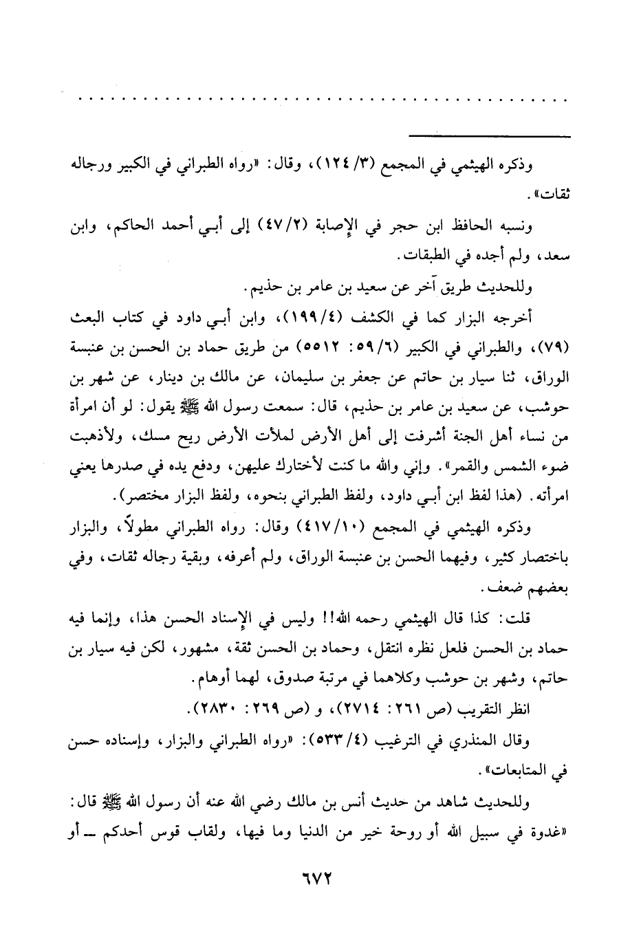 أخرجه البزّار كما في الكشف (4/ 199)، وابن أبي داود في كتاب البعث (79)، والطبراني في الكبير (6/ 59: 5512) من طريق حماد بن الحسن بن عنبسة الوراق، ثنا سيار بن حاتم عن جعفر بن سليمان، عن مالك بْنِ دِينَارٍ، عَنْ شَهْرِ بْنِ حَوْشَبٍ، عَنْ سَعِيدِ بْنِ عَامِرِ بْنِ حِذْيَمٍ، قَالَ: سمعت رسول الله -صلى الله عليه وسلم- يقول: لو أن امرأة من نساء أهل الجنة أشرفت إلى أهل الأرض لملأت الأرض ريح مسك، ولأذهبت ضوء الشمس والقمر". وإني والله ما كنت لأختارك عليهن، ودفع يده في صدرها يعني امرأته. (هذا لفظ ابن أبي داود، ولفظ الطبراني بنحوه، ولفظ البزّار مختصر).