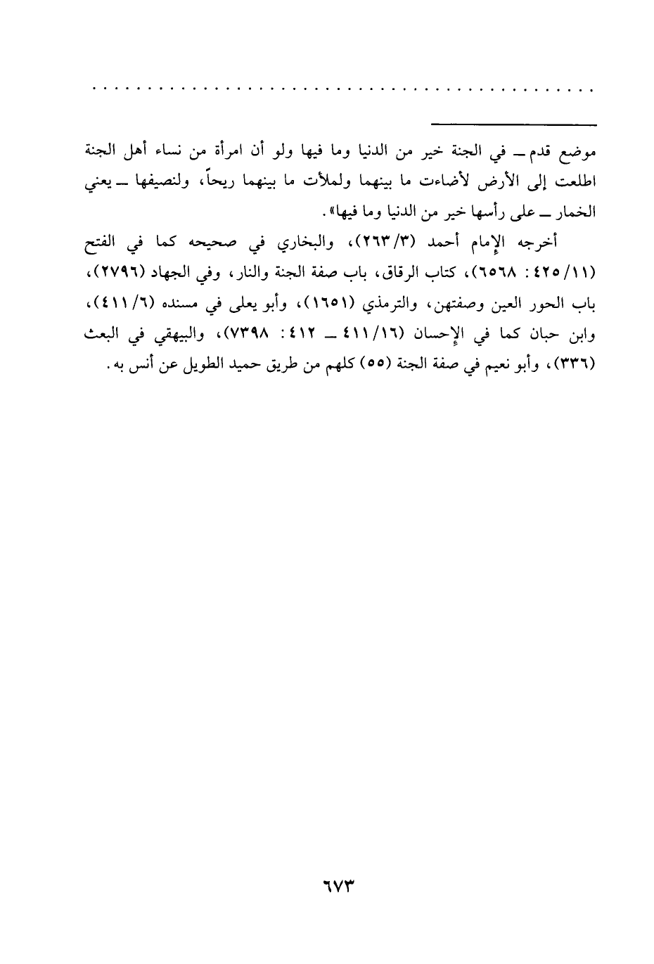 أخرجه الإِمام أحمد (3/ 263)، والبخاري في صحيحه كما في الفتح (11/ 425: 6568)، كتاب الرقاق، باب صفة الجنة والنار، وفي الجهاد (2796)، باب الحور العين وصفتهن، والترمذي (1651)، وأبو يعلى في مسنده (6/ 411)، وابن حبّان كما في الإِحسان (16/ 411 - 412: 7398)، والبيهقي في البعث (336)، وأبو نعيم في صفة الجنة (55) كلهم من طريق حميد الطويل عن أنس به.