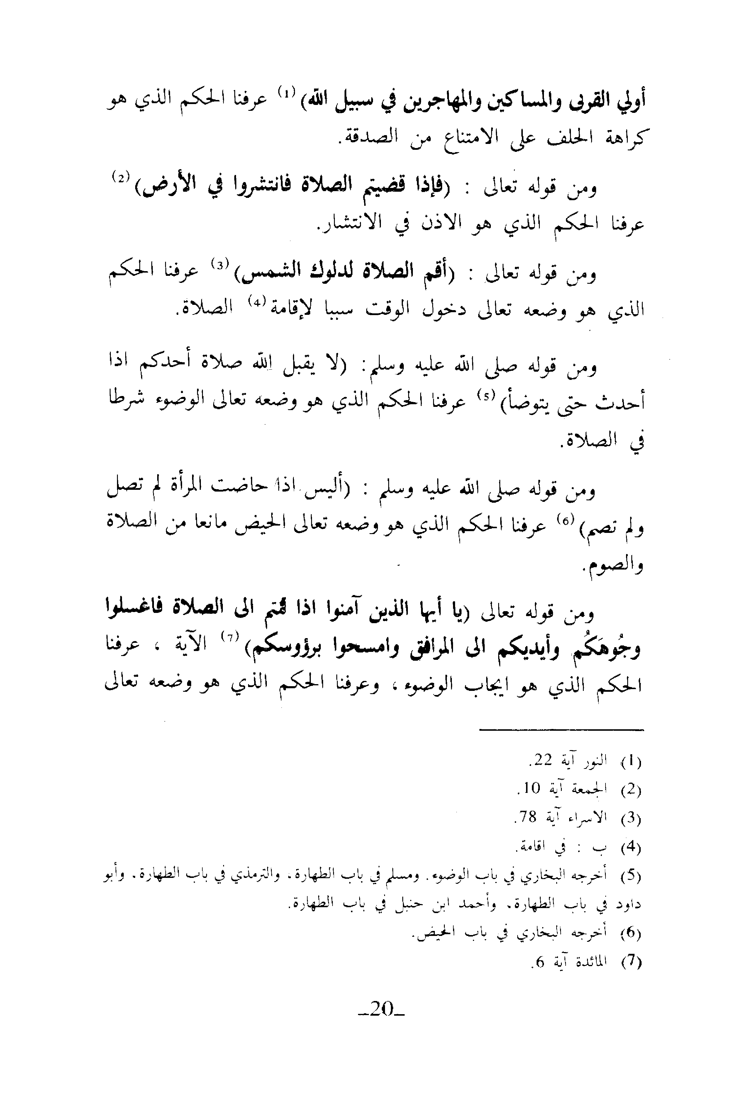 وَمِنْ قَوْلِهِ صَلَّى اللَّهُ عَلَيْهِ وَسَلَّمَ «لاَ يَقْبَلُ اللهُ صَلاةَ أَحَدِكُمْ إِذَا أَحْدَثَ حَتَّى يَتَوَضَّأَ» (¬5) عَرَفْنَا الْحُكْمَ الذَّي هُوَ وَضْعُهُ تَعَالَى الْوُضُوءُ شَرْطًا فِي الصَّلَاةِ.