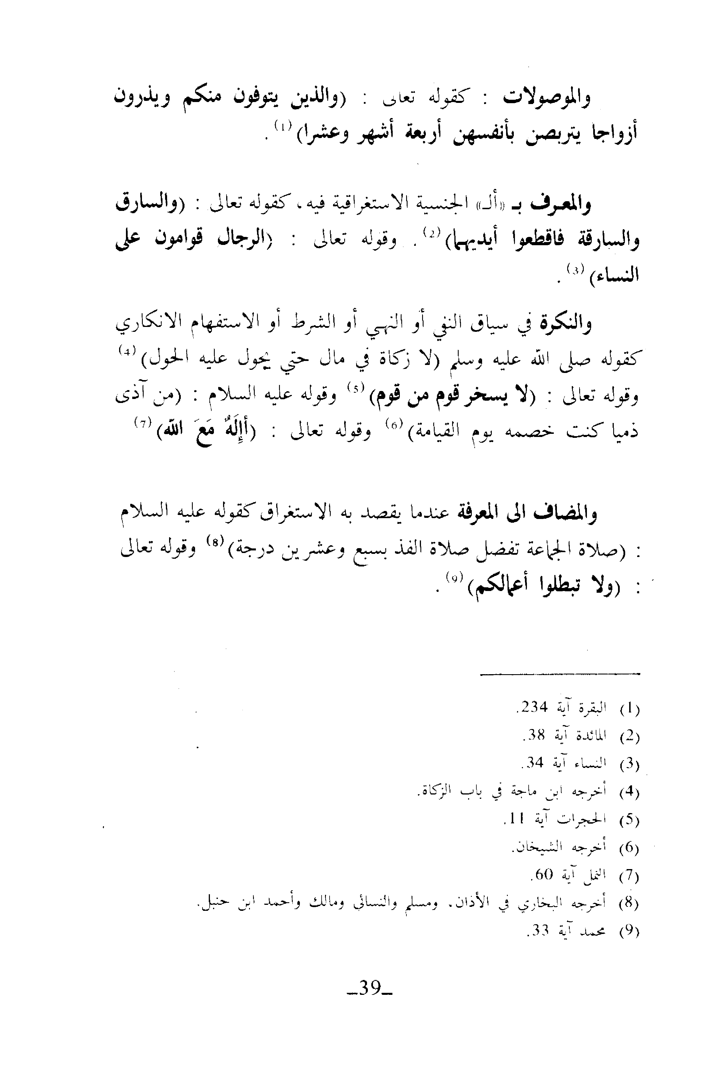 وَالمَوْصُولَاتُ: كَقَوْلِهِ تَعَالَى: {وَالَّذِينَ يُتَوَفَّوْنَ مِنْكُمْ وَيَذَرُونَ أَزْوَاجًا يَتَرَبَّصْنَ بِأَنْفُسِهِنَّ أَرْبَعَةَ أَشْهُرٍ وَعَشْرًا} (¬1).