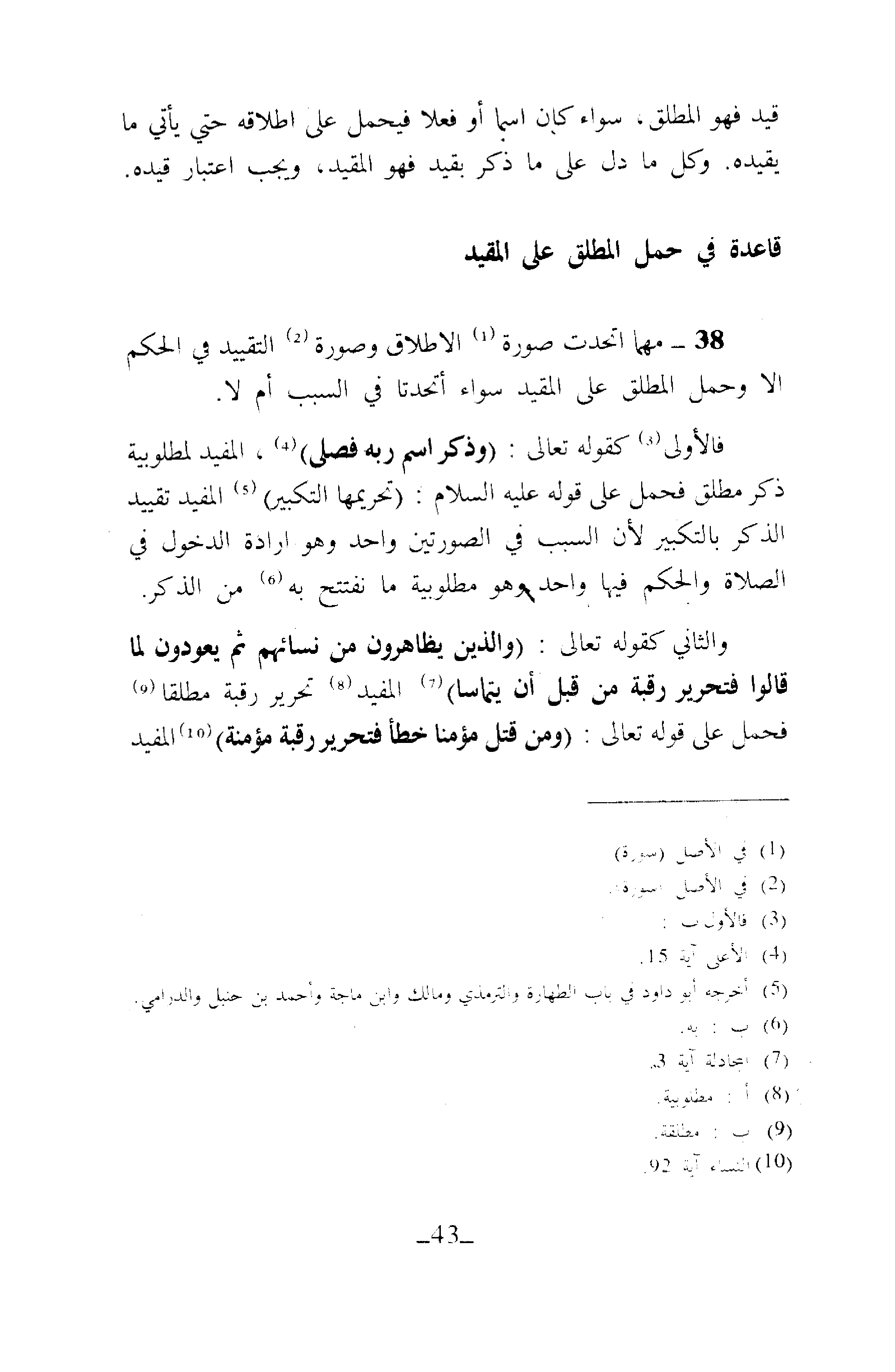 38 - مَهْمَا اتَّحَدَتْ صُورَةُ (¬1) الْإِطْلَاقِ وَصُورَةُ (¬2) التَّقْيِيدِ فِي الْحُكْمِ إِلَّا وَحُمِلَ الْمُطْلَقُ عَلَى الْمُقَيَّدِ، سَوَاءٌ اتَّحَدَتَا فِي السَّبَبِ أَمْ لَا.