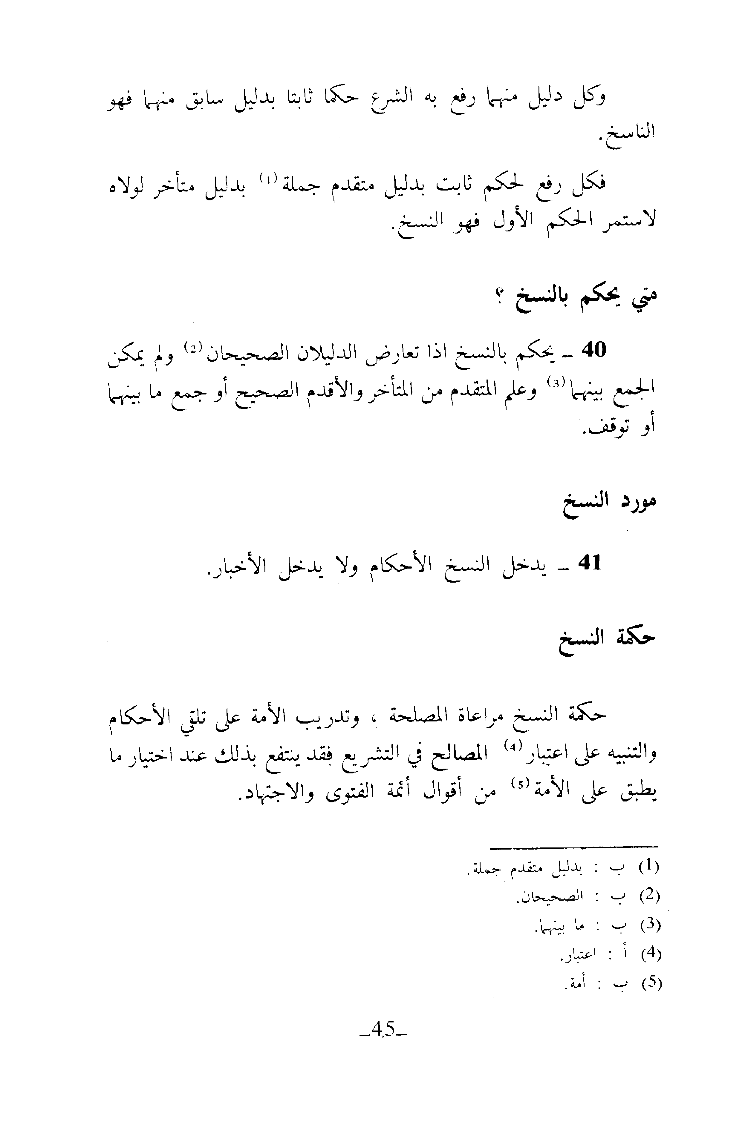 40 - يُحْكَمُ بِالنَّسْخِ إِذَا تَعَارَضَ الدَّلِيلَانِ الصَّحِيحَانِ (¬2) وَلَمْ يُمْكِنِ الْجَمْعُ بَيْنَهُمَا (¬3) وَعُلِمَ الْمُتَقَدِّمُ مِنَ الْمُتَأَخِّرِ، وَإِلَّا قُدِّمَ الصَّحِيحُ أَوْ جُمِعَ مَا بَيْنَهُمَا أَوْ تُوُقِّفَ.