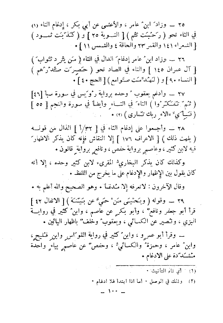 25 - وزاد ابن عامر، والأعشى عن أبي بكر، إدغام التاء في الثاء نحو {رَحُبَتْ ثُمَّ} [التوبة 25] و {كَذَّبَتْ ثَمُودُ} [الشعراء 141 والقمر 23 والحاقة 4 والشمس 11].