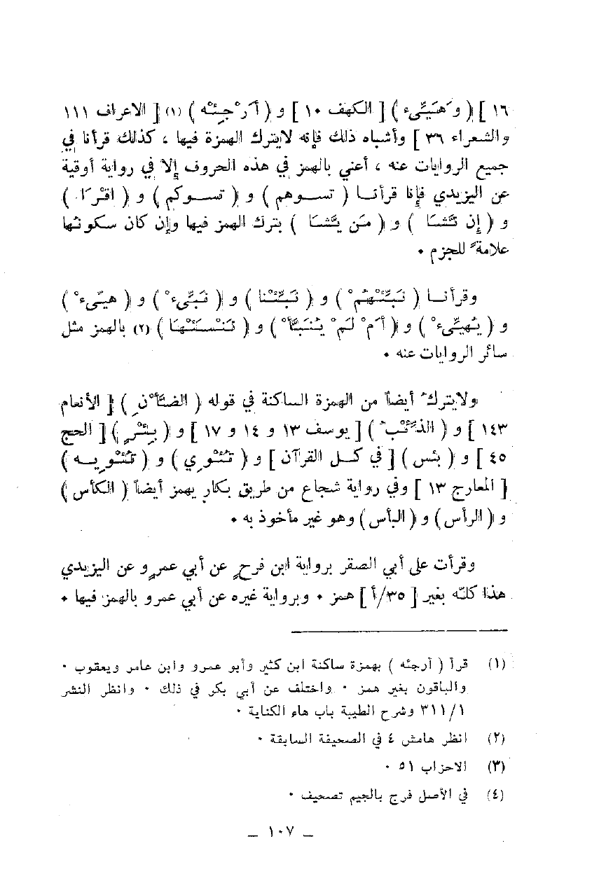 16] {وَهَيِّئْ} [الكهف 10] و {أَرْجِهْ} [الأعراف 111 والشعراء 36] وأشباه ذلك فإنه لا يترك الهمزة فيها، كذلك قرأنا في جميع الروايات عنه، أعني بالهمز في هذه الحروف إلا في رواية أوقية عن اليزيدي فإنا قرأنا {تَسُؤْهُمْ} و {تَسُؤْكُمْ} و {اقْرَأْ} و {إِنْ نَشَأْ} و {وَمَنْ يَشَأْ} بترك الهمز فيها وإن كان سكونها علامة للجزم.