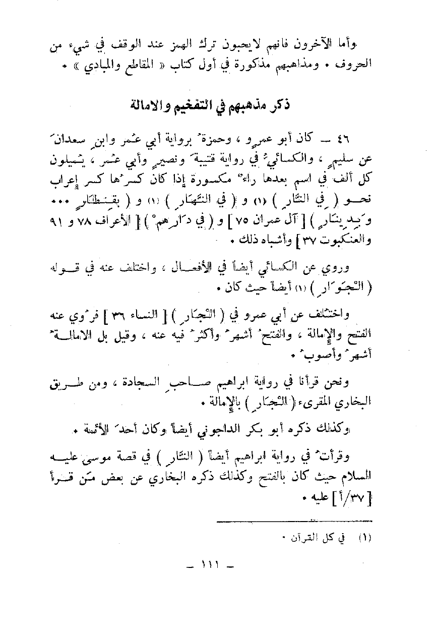 46 - كان أبو عمرو، وحمزة برواية أبي عمر وابن سعدان عن سليم، والكسائي في رواية قتيبة ونصير وأبي عمر، يميلون كل ألف في اسم بعدها راء مكسورة إذ كان كسرها كسر إعراب نحو {فِي النَّارِ} و {فِي النَّهَارِ} و {بِقِنْطَارٍ ..... بِدِينَارٍ} [آل عمران 75] و {فِي دَارِهِمْ} [الأعراف 78 و91 والعنكبوت 37] وأشباه ذلك.