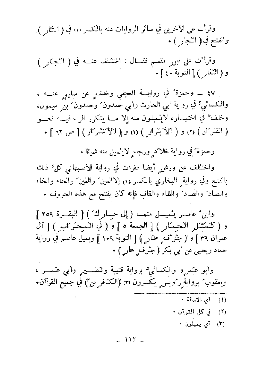 47 - وحمزة في رواية العجلي وخلف عن سليم عنه، والكسائي في رواية أبي الحارث وأبي حمدون وحمدون بن ميمون، وخلف في اختياره لا يميلون منه إلا ما يتكرر الراء فيه نحو {الْقَرَارُ} و {الْأَبْرَارِ} و {الْأَشْرَارِ} [ص 62].