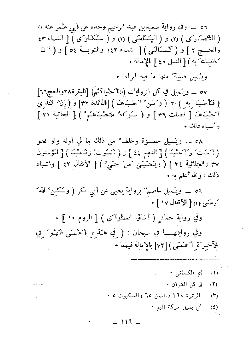 56 - وفي رواية سعيد بن عبد الرحيم وحده عن أبي عمر عنه {النَّصَارَى} و {الْيَتَامَى} و {سُكَارَى} [النساء 43 والحج 2] و {كُسَالَى} [النساء 142 والتوبة 54] و {أَنَا آتِيكَ بِهِ} [النمل 40] بالإمالة.