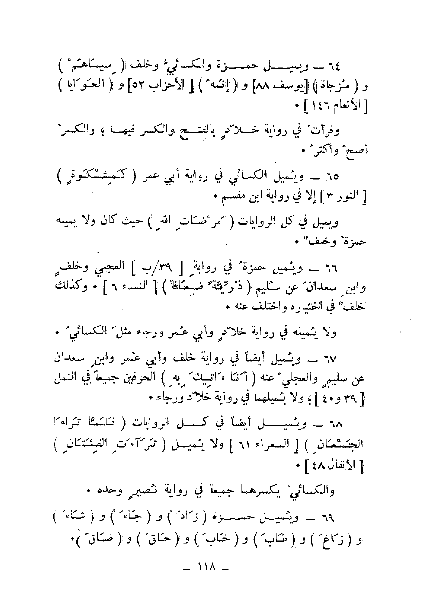 64 - ويميل حمزة والكسائي وخلف {سِيمَاهُمْ} و {مُزْجَاةٍ} [يوسف 88] و {إِنَّهُ} [الأحزاب 52] و {الْحَوَايَا} [الأنعام 146].