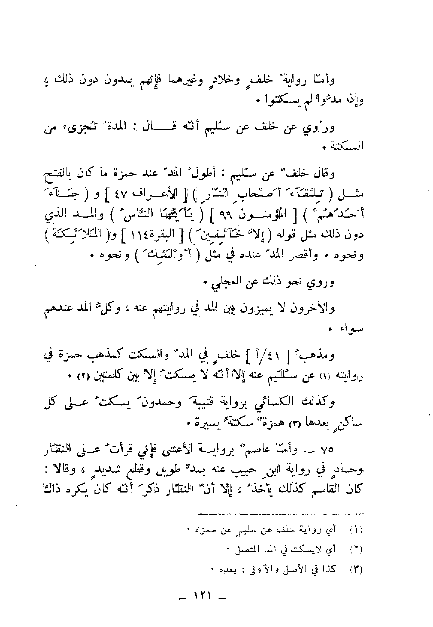 وقال خلف عن سليم: أطول المد عند حمزة ما كان بالفتح مثل {تِلْقَاءَ أَصْحَابِ النَّارِ} [الأعراف 47] و {جَاءَ أَحَدَهُمُ} [المؤمنون 99] {يَا أَيُّهَا النَّاسُ} والمد الذي دون ذلك مثل قوله {إِلَّا خَائِفِينَ} [البقرة 114] و {الْمَلَائِكَةِ} ونحوه. وأقصر المد عنده في مثل {أُولَئِكَ} ونحوه.