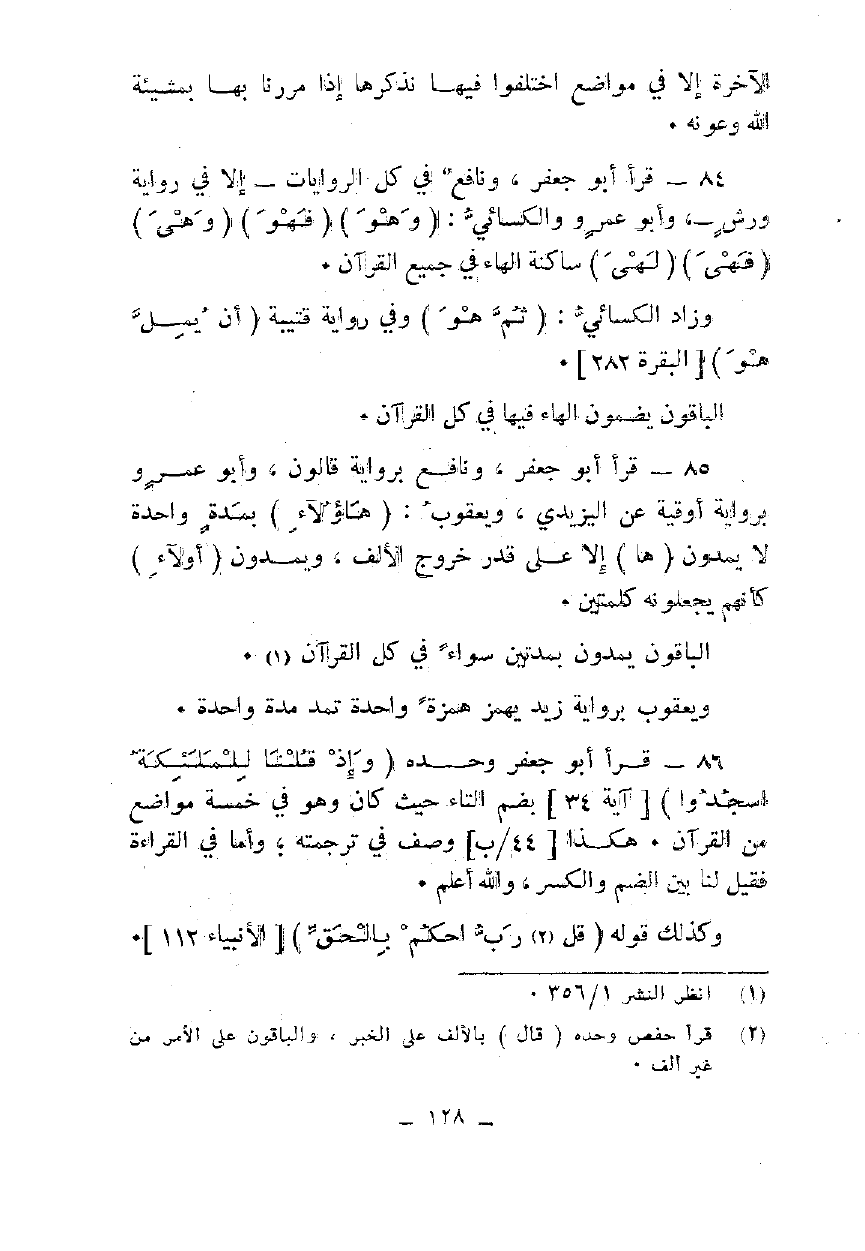 84 - قرأ أبو جعفر، ونافع في كل الروايات، إلا في رواية ورش، وأبو عمرو والكسائي: {وَهُوَ} {فَهُوَ} {وَهِيَ} {فَهِيَ} {لَهِيَ} ساكنة الهاء في جميع القرآن.