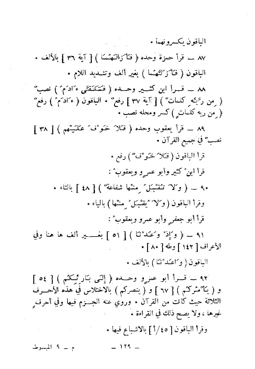 88 - قرأ ابن كثير وحده {فَتَلَقَّى آدَمُ} نصب {مِنْ رَبِّهِ كَلِمَاتٍ} [آية 37] رفع. الباقون {آدَمُ} رفع {مِنْ رَبِّهِ كَلِمَاتٍ} كسر ومحله نصب.