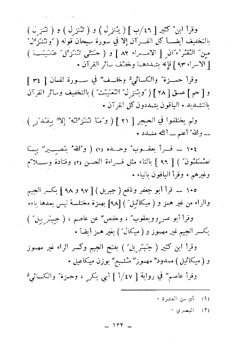 105 - قرأ أبو جعفر ونافع {جِبْرِيلُ} [97 و98] بكسر الجيم والراء من غير همز و {وَمِيكَائلَ} [98] بهمزة مختلة ليس بعدها ياء.