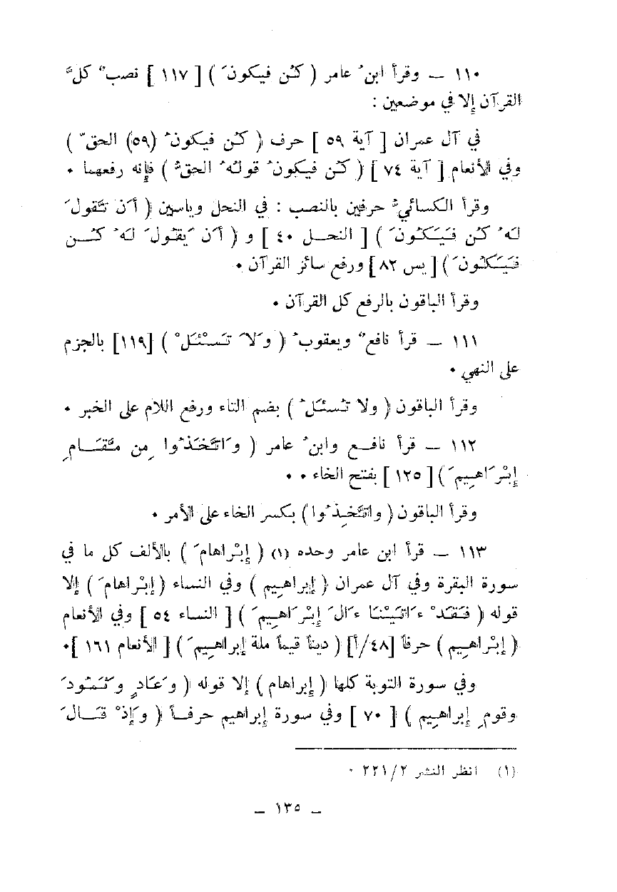 113 - قرأ ابن عامر وحده {إِبْرَاهِيمَ} بالألف كل ما في سورة البقرة وفي آل عمران {إِبْرَاهِيمَ} وفي النساء {إِبْرَاهِيمَ} إلا قوله {فَقَدْ آتَيْنَا آلَ إِبْرَاهِيمَ} [النساء 54] وفي الأنعام {إِبْرَاهِيمَ} حرفا {دِينًا قِيَمًا مِلَّةَ إِبْرَاهِيمَ} [الانعام 161].