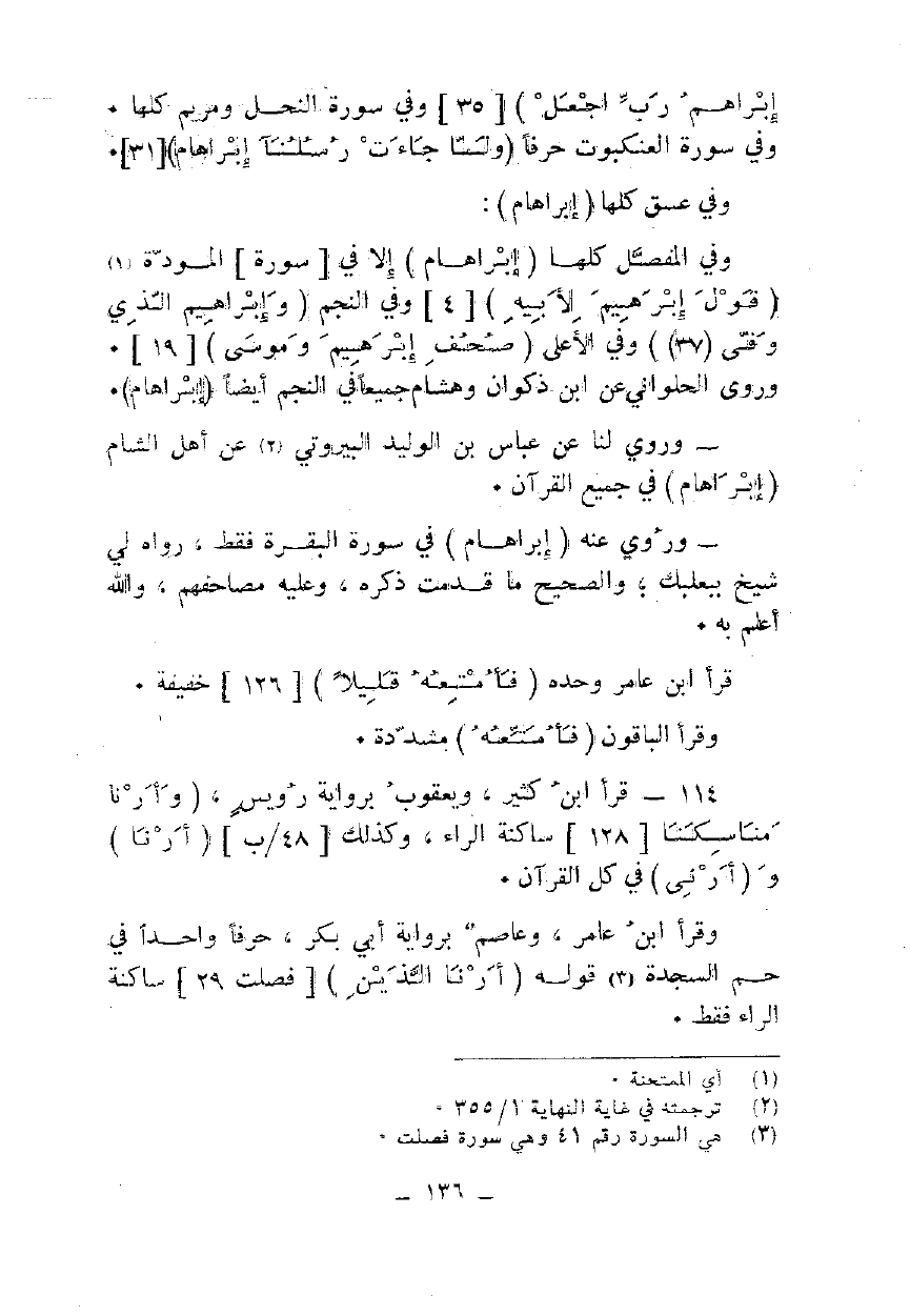 - وروي عنه {إِبْرَاهِامَ} في سورة البقرة فقط، رواه لي شيخ ببعلبك؛ والصحيح ما قدمت ذكره، وعليه مصاحفهم، والله أعلم به.