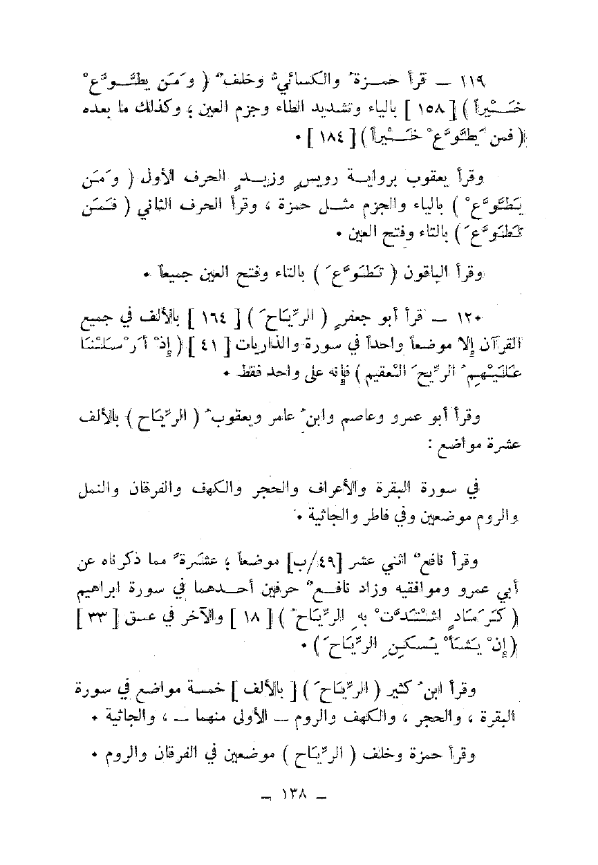 119 - قرأ حمزة والكسائي وخلف {وَمَنْ تَطَوَّعَ خَيْرًا} [158] بالياء وتشديد الطاء وجزم العين؛ وكذلك ما بعده {فَمَنْ تَطَوَّعَ خَيْرًا} [184].