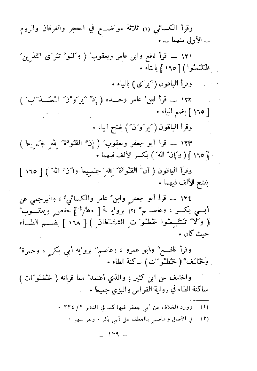 124 - قرأ أبو جعفر وابن عامر والكسائي، والبرجمي عن أبي بكر، وعاصم برواية حفص ويعقوب {وَلَا تَتَّبِعُوا خُطُوَاتِ الشَّيْطَانِ} [168] بضم الطاء حيث كان.