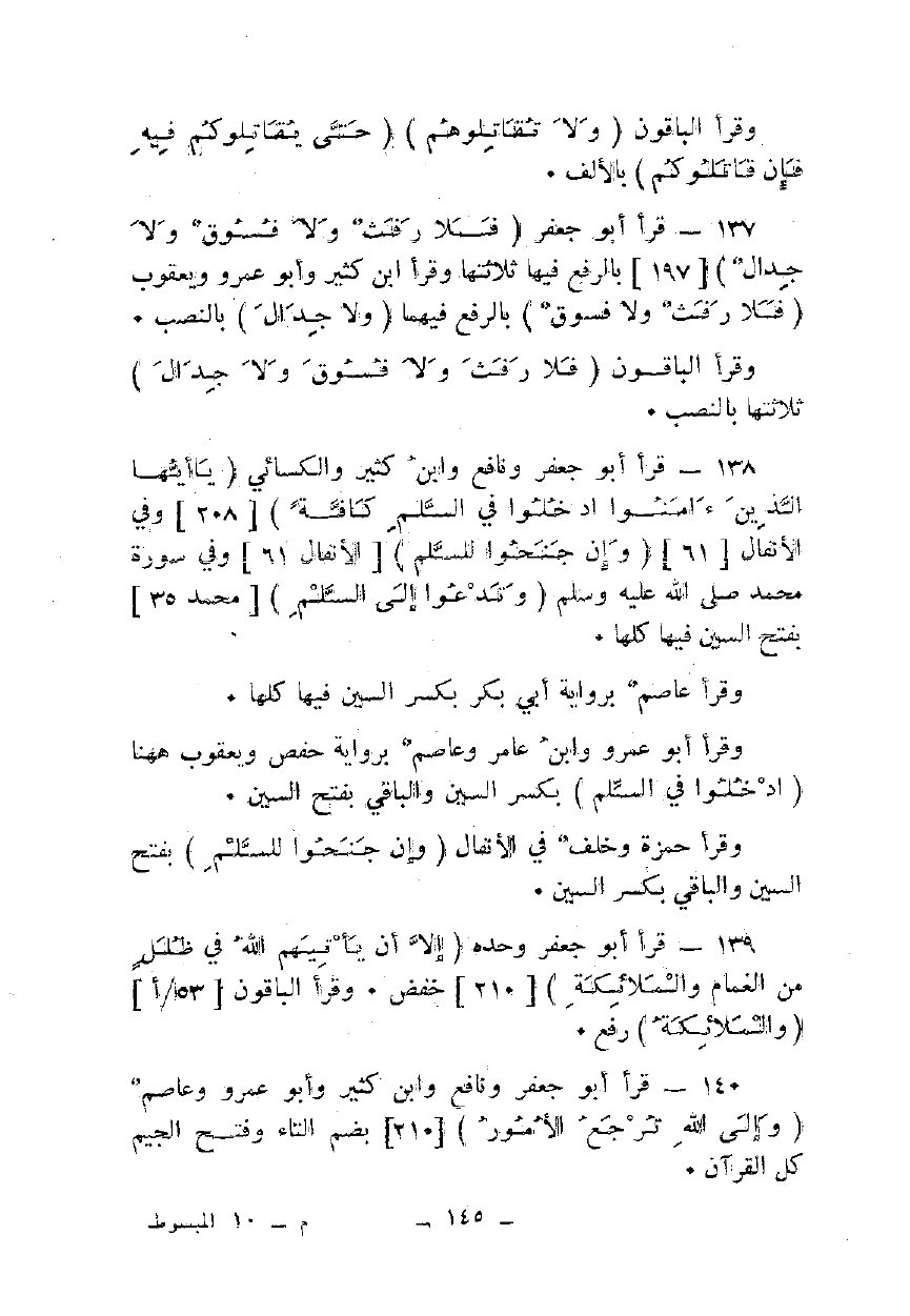 138 - قرأ أبو جعفر ونافع وابن كثير والكسائي {يَا أَيُّهَا الَّذِينَ آمَنُوا ادْخُلُوا فِي السِّلْمِ} [208] وفي الأنفال [61] {وَإِنْ جَنَحُوا لِلسَّلْمِ} [الأنفال 61] وفي سورة محمد صلى الله عليه وسلم {وَتَدْعُوا إِلَى السَّلْمِ} [محمد 35] بفتح السين فيها كلها.