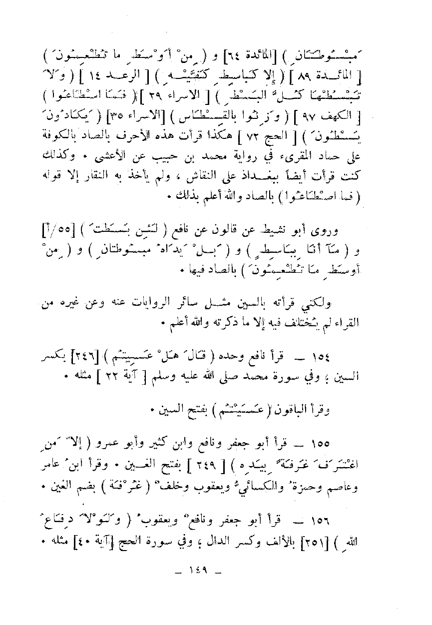 مَبْسُوطَتَانِ} [المائدة 64] و {مِنْ أَوْسَطِ مَا تُطْعِمُونَ} [المائدة 89] {إِلَّا كَبَاسِطِ كَفَّيْهِ} [الرعد 14] {وَلَا تَبْسُطْهَا كُلَّ الْبَسْطِ} [الإسراء 29] {فَمَا اسْتَطَاعُوا} [الكهف 97] {وَزِنُوا بِالْقِسْطَاسِ} [الإسراء 35] {يَكَادُونَ يَسْطُونَ} [الحج 72] هكذا قرأت هذه الأحرف بالصاد بالكوفة على حماد المقرئ في رواية محمد بن حبيب عن الأعشى. وكذلك كنت قرأت أيضا ببغداد على النقاش، ولم يأخذ به النقار إلا قوله {فَمَا اسْتَطَاعُوا} بالصاد والله أعلم بذلك.
