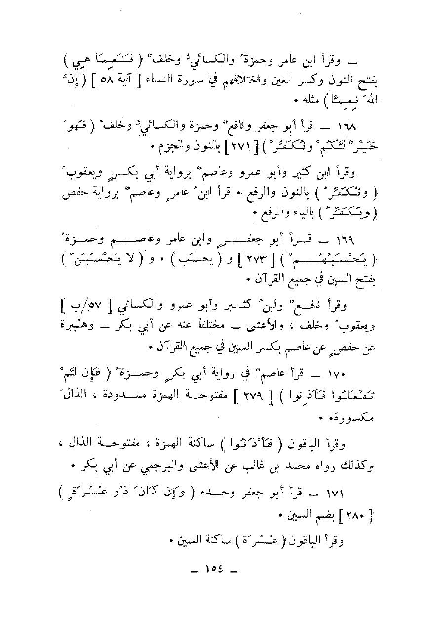 169 - قرأ أبو جعفر وابن عامر وعاصم وحمزة {يَحْسَبُهُمُ} [273] و {يَحْسَبُ}. و {وَلَا يَحْسَبَنَّ} بفتح السين في جميع القرآن.