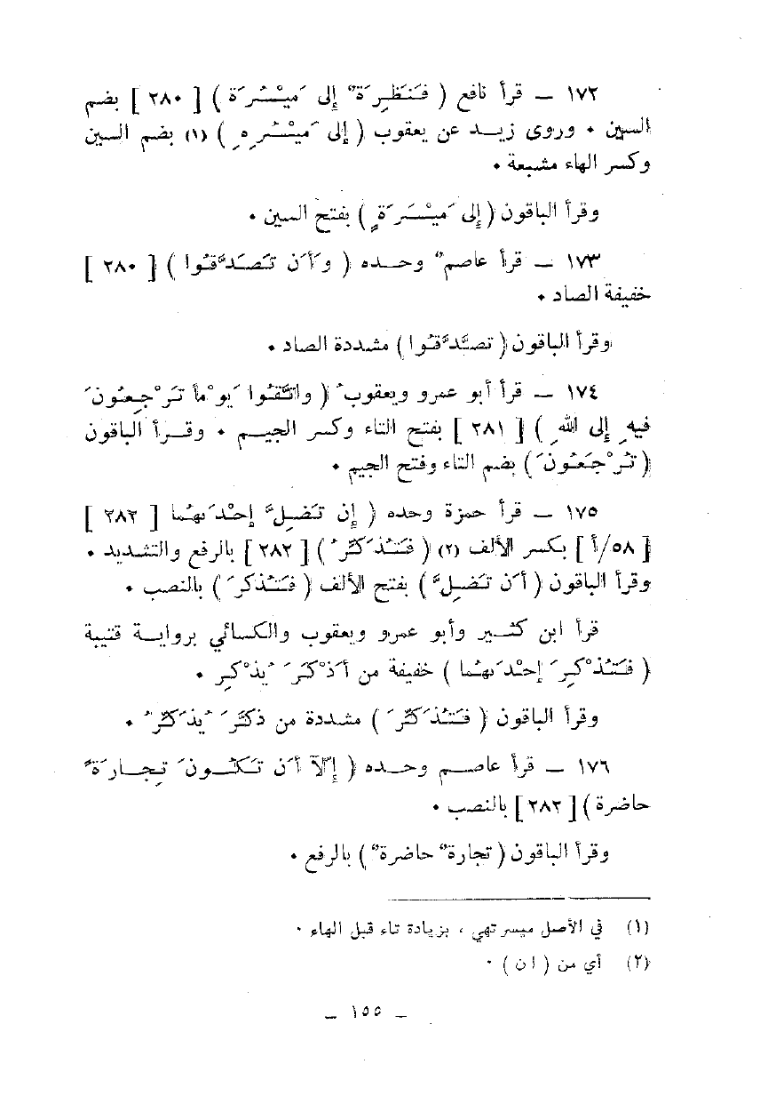 172 - قرأ نافع {فَنَظِرَةٌ إِلَى مَيْسَرَةٍ} [280] بضم السين. وروى زيد عن يعقوب {إِلَى مَيْسَرَةٍ} بضم السين وكسر الهاء مشبعة.