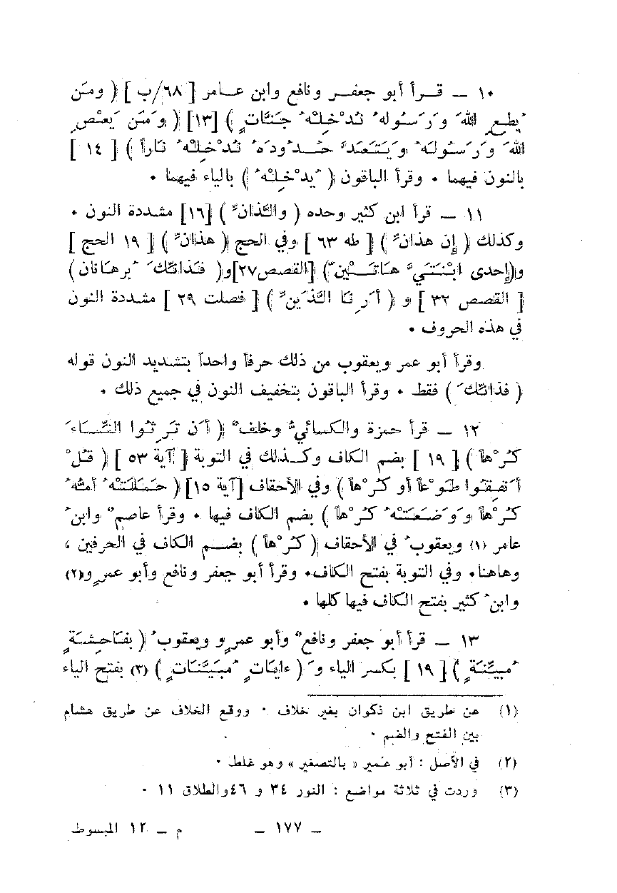 10 - قرأ أبو جعفر ونافع وابن عامر {وَمَنْ يُطِعِ اللَّهَ وَرَسُولَهُ يُدْخِلْهُ جَنَّاتٍ} [13] {وَمَنْ يَعْصِ اللَّهَ وَرَسُولَهُ وَيَتَعَدَّ حُدُودَهُ يُدْخِلْهُ نَارًا} [14] بالنون فيهما. وقرأ الباقون {يُدْخِلْهُ} بالياء فيهما.