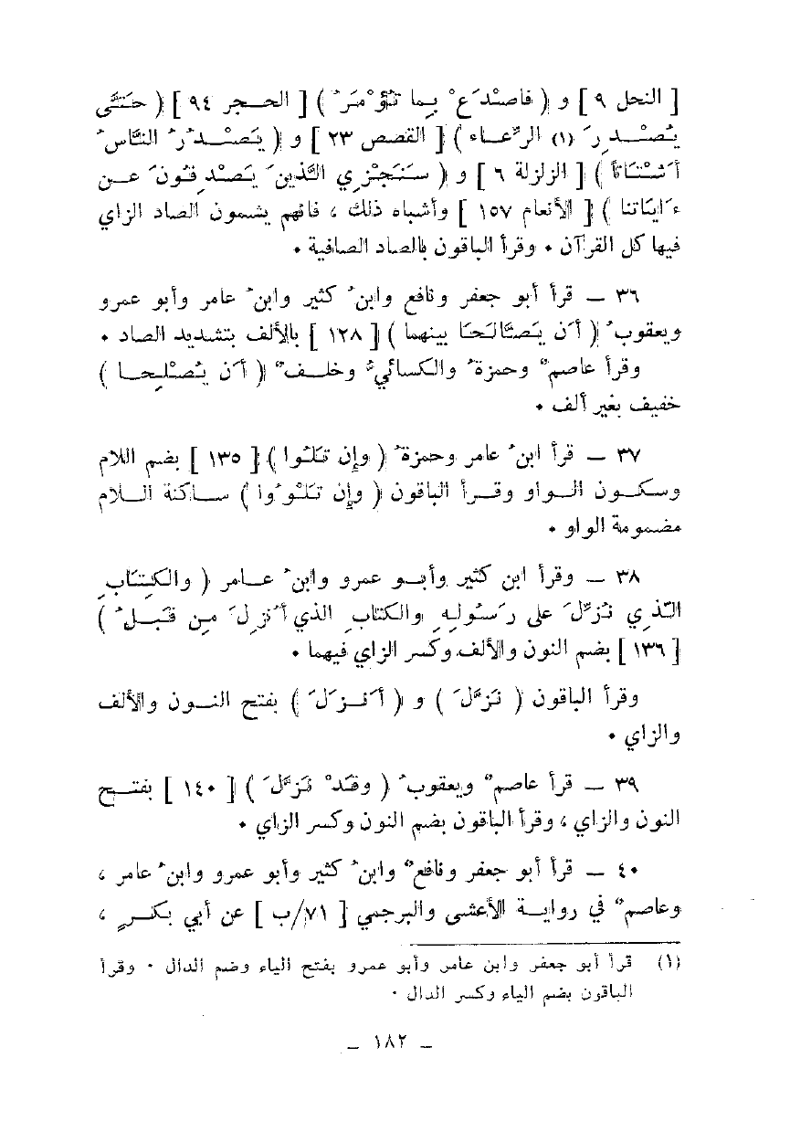 38 - وقرأ ابن كثير وأبو عمرو وابن عامر {وَالْكِتَابِ الَّذِي نَزَّلَ عَلَى رَسُولِهِ وَالْكِتَابِ الَّذِي أَنْزَلَ مِنْ قَبْلُ} [136] بضم النون والألف وكسر الزاي فيهما.