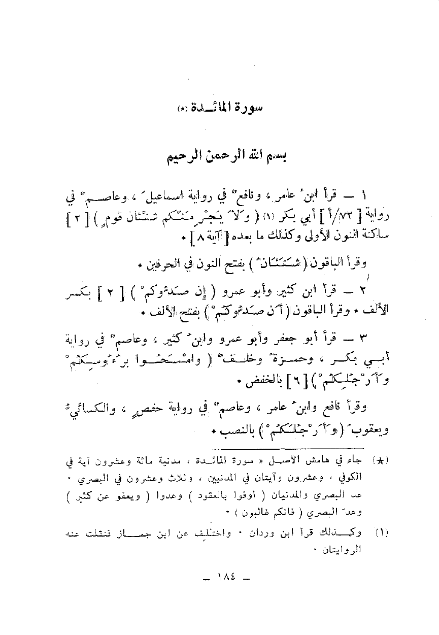 1 - قرأ ابن عامر، ونافع في رواية إسماعيل، وعاصم في رواية أبي بكر {وَلَا يَجْرِمَنَّكُمْ شَنَآنُ قَوْمٍ} [2] ساكنة النون الأولى وكذلك ما بعده [آية 8].