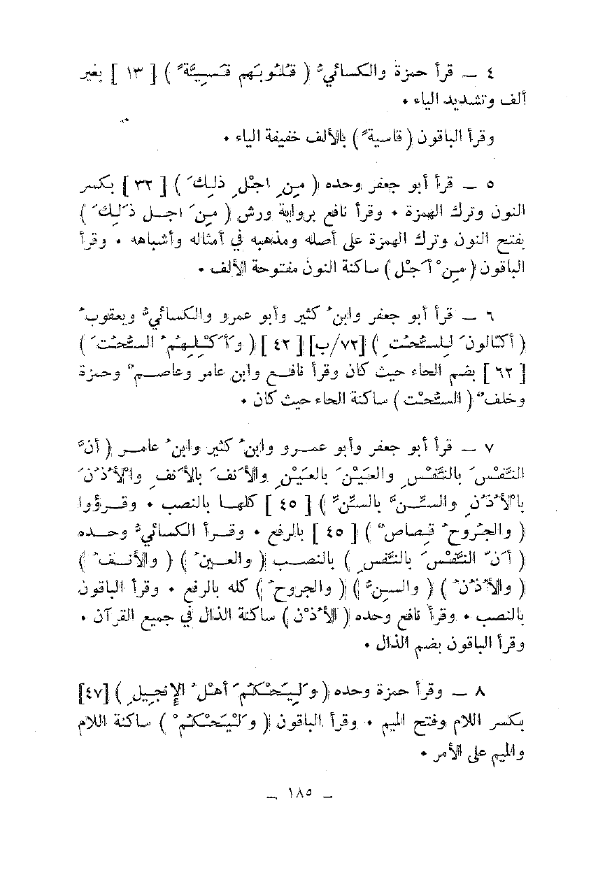 8 - وقرأ حمزة وحده {وَلْيَحْكُمْ أَهْلُ الْإِنْجِيلِ} [47] بكسر اللام وفتح الميم. وقرأ الباقون {وَلْيَحْكُمْ} ساكنة اللام والميم على الأمر.
