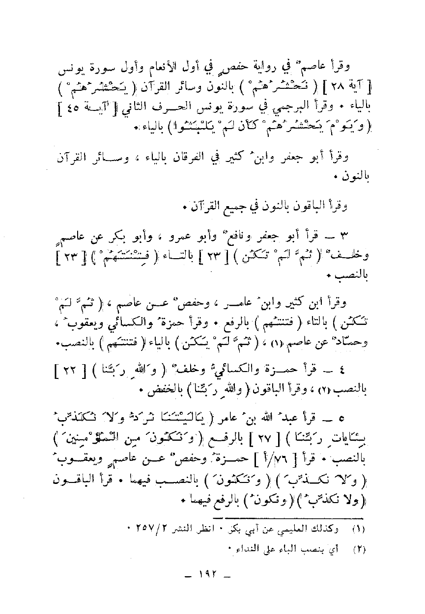 وقرأ عاصم في رواية حفص في أول الأنعام وأول سورة يونس [آية 28] {نَحْشُرُهُمْ} بالنون وسائر القرآن {يَحْشُرُهُمْ} بالياء. وقرأ البرجمي في سورة يونس الحرف الثاني [آية 45] {وَيَوْمَ يَحْشُرُهُمْ كَأَنْ لَمْ يَلْبَثُوا} بالياء.