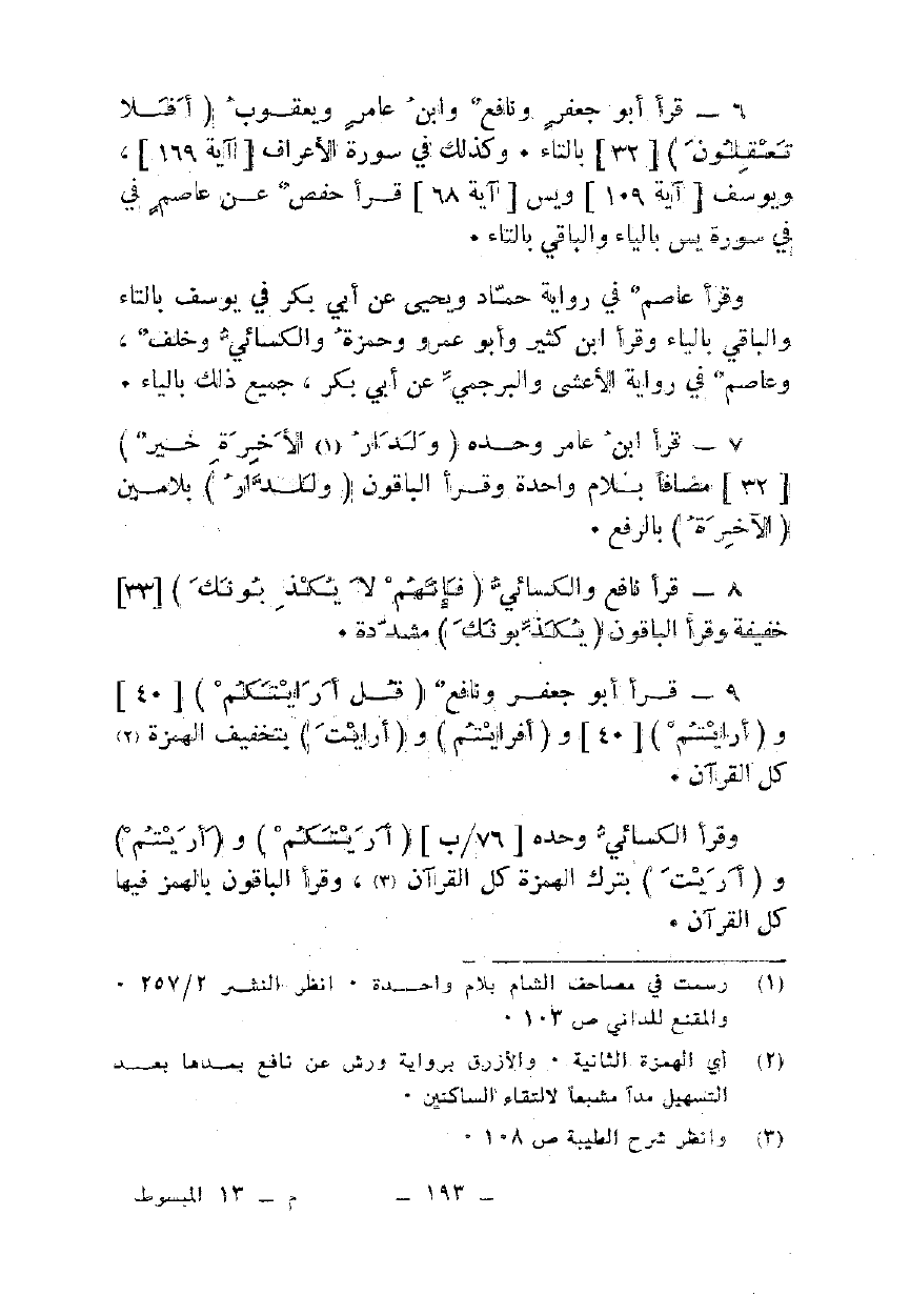 6 - قرأ أبو جعفر ونافع وابن عامر ويعقوب {أَفَلَا تَعْقِلُونَ} [32] بالتاء. وكذلك في سورة الأعراف [آية 169]، ويوسف [آية 109] ويس [آية 68] قرأ حفص عن عاصم في سورة يس بالياء والباقي بالتاء.