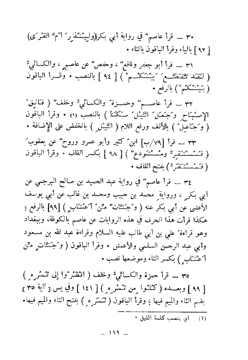34 - قرأ عاصم في رواية عبد الحميد بن صالح البرجمي عن أبي بكر، ورواية محمد بن حبيب ومحمد بن غالب عن أبي يوسف الأعشى عن أبي بكر عنه {وَجَنَّاتٍ مِنْ أَعْنَابٍ} [99] بالرفع؛ هكذا قرأت هذا الحرف في هذه الروايات عن عاصم بالكوفة، وببغداد وهو قراءة علي بن أبي طالب عليه السلام وقراءة عبد الله بن مسعود وأبي عبد الرحمن السلمي والأعمش. وقرأ الباقون {وَجَنَّاتٍ مِنْ أَعْنَابٍ} بكسر التاء وموضعها نصب.