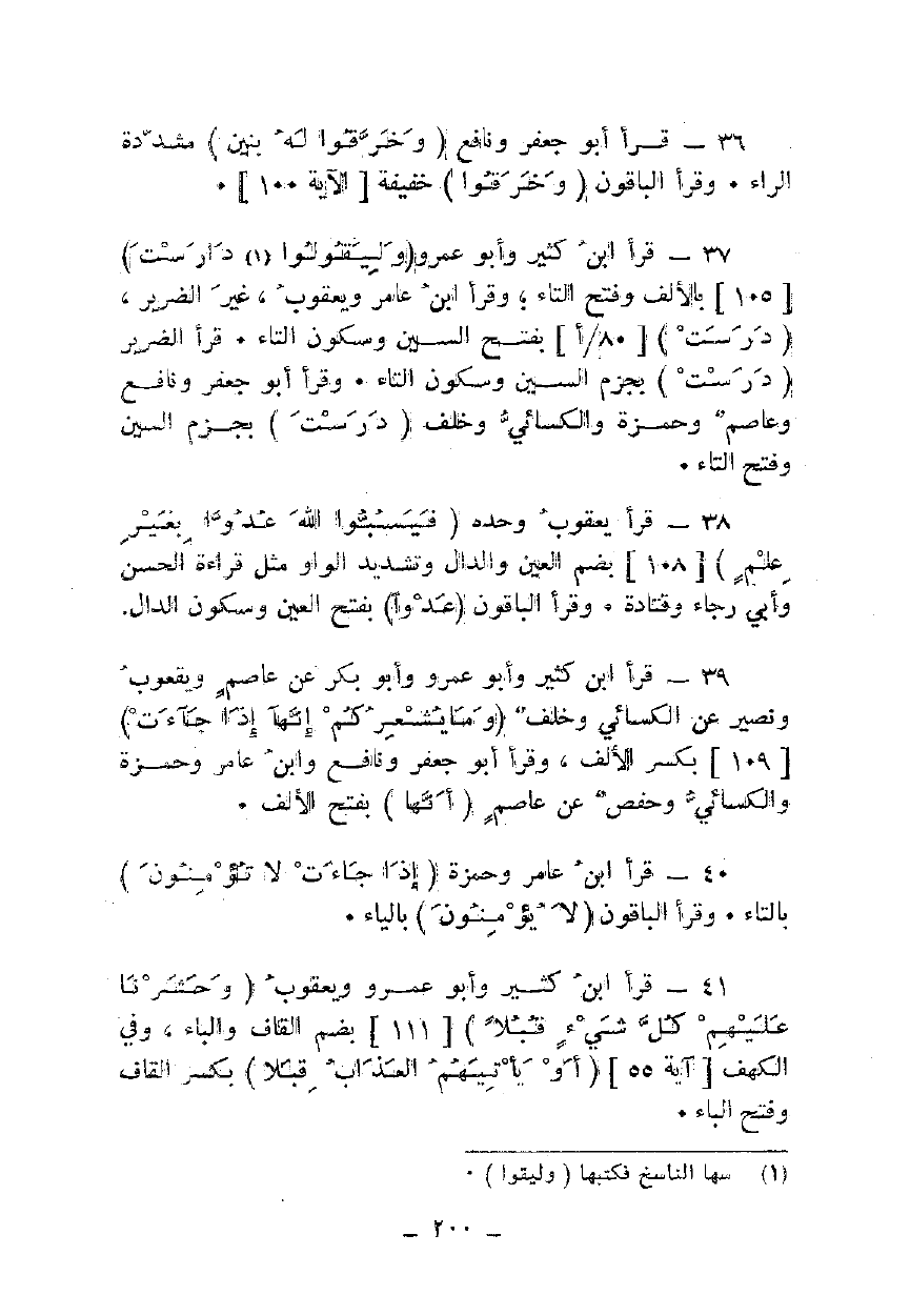 38 - قرأ يعقوب وحده {فَيَسُبُّوا اللَّهَ عَدْوًا بِغَيْرِ عِلْمٍ} [108] بضم العين والدال وتشديد الواو مثل قراءة الحسن وأبي رجاء وقتادة. وقرأ الباقون {عَدْوًا} بفتح العين وسكون الدال.