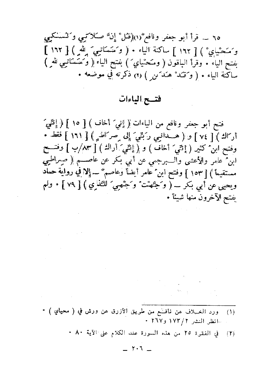 65 - قرأ أبو جعفر ونافع {قُلْ إِنَّ صَلَاتِي وَنُسُكِي وَمَحْيَايَ} [162] ساكنة الياء. {وَمَمَاتِي لِلَّهِ} [162] بفتح الياء. وقرأ الباقون {وَمَحْيَايَ} بفتح الياء {وَمَمَاتِي لِلَّهِ} ساكنة الياء. {وقد هدن} ذكرته في موضعه.