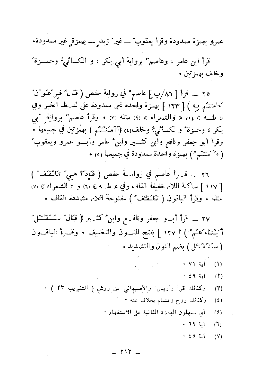 25 - قرأ عاصم في رواية حفص {قَالَ فِرْعَوْنُ آمَنْتُمْ بِهِ} [123] بهمزة واحدة غير ممدودة على لفظ الخبر وفي "طه" "والشعراء" مثله. وقرأ عاصم برواية أبي بكر، وحمزة والكسائي وخلف {أَأَمِنْتُمْ} بهمزتين في جميعها. وقرأ أبو جعفر ونافع وابن كثير وابن عامر وأبو عمرو ويعقوب {أَأَمِنْتُمْ} بهمزة واحدة ممدودة في جميعها.