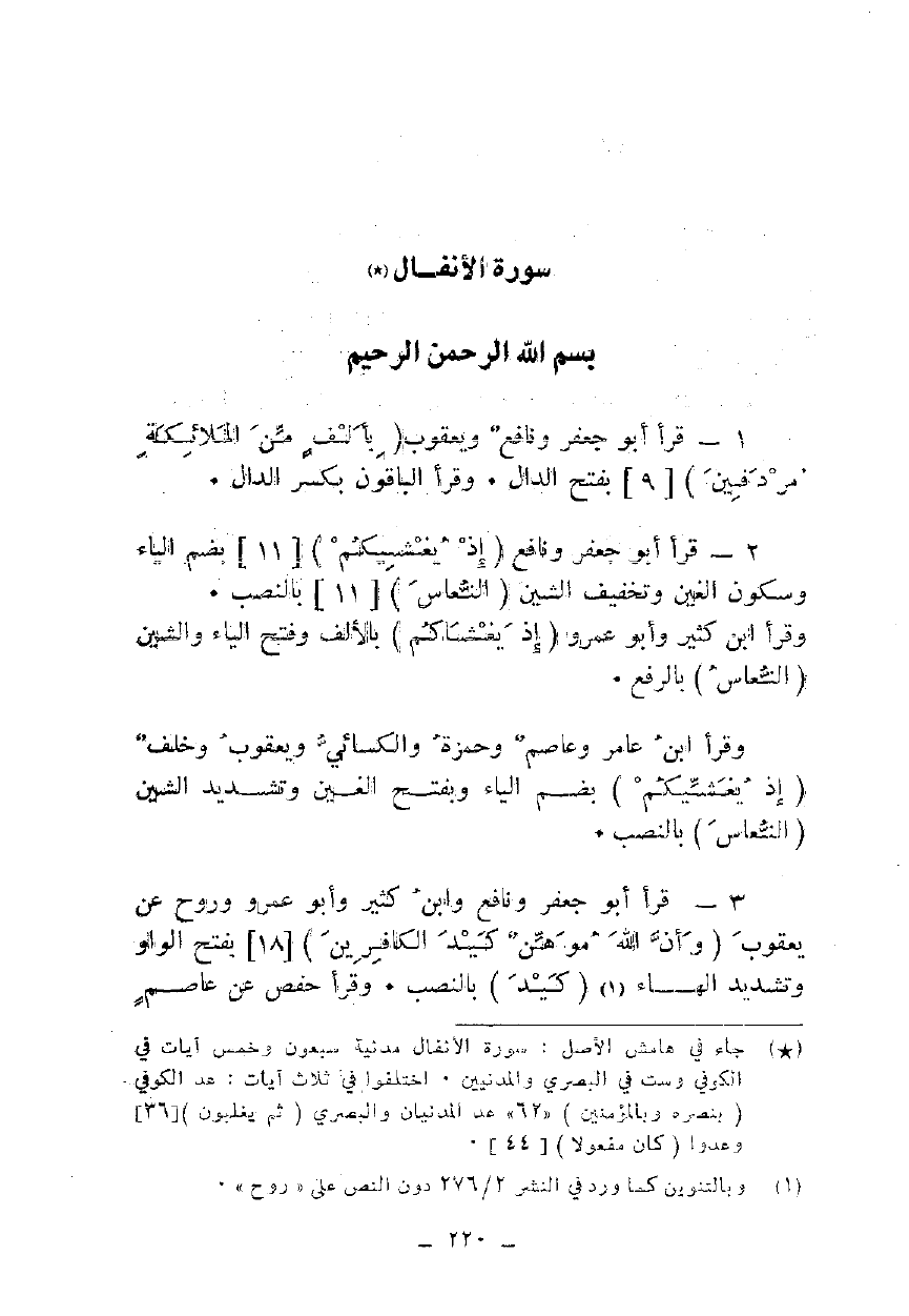 2 - قرأ أبو جعفر ونافع {إِذْ يُغَشِّيكُمُ} [11] بضم الياء وسكون الغين وتخفيف الشين {النُّعَاسَ} [11] بالنصب.