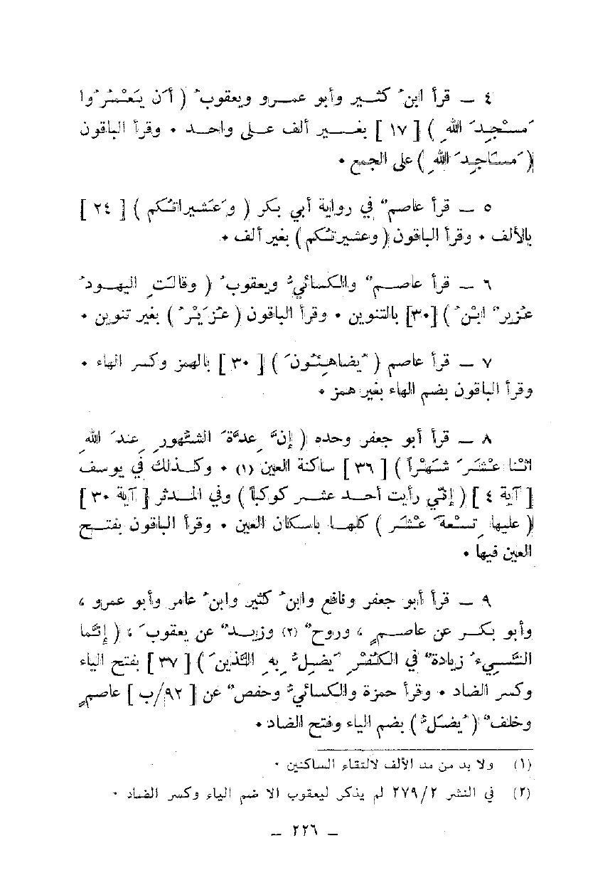 4 - قرأ ابن كثير وأبو عمرو ويعقوب {أَنْ يَعْمُرُوا مَسَاجِدَ اللَّهِ} [17] بغير ألف على واحد. وقرأ الباقون {مَسَاجِدَ اللَّهِ} على الجمع.