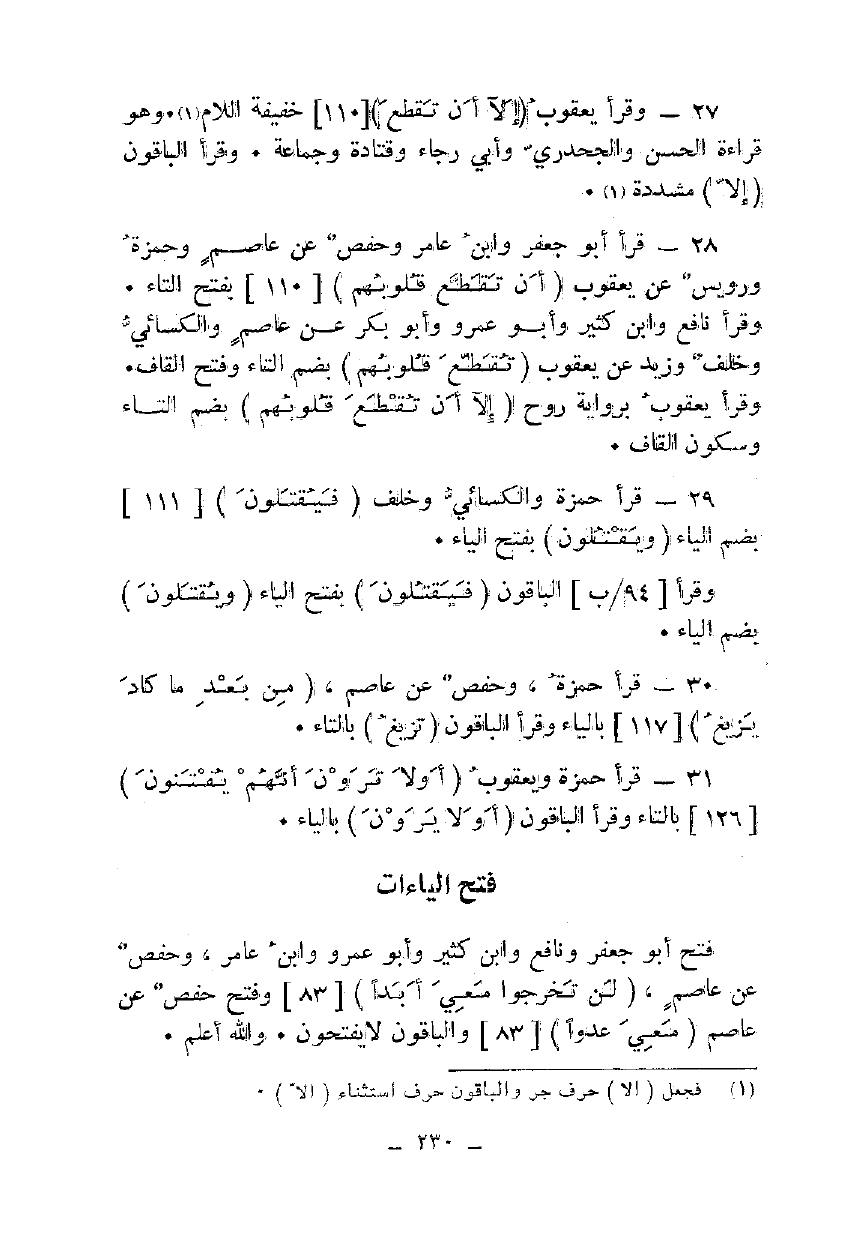 27 - وقرأ يعقوب {إِلَّا أَنْ تَقَطَّعَ} [110] خفيفة اللام. وهو قراءة الحسن والجحدري وأبي رجاء وقتادة وجماعة. وقرأ الباقون {إِلَّا} مشددة.