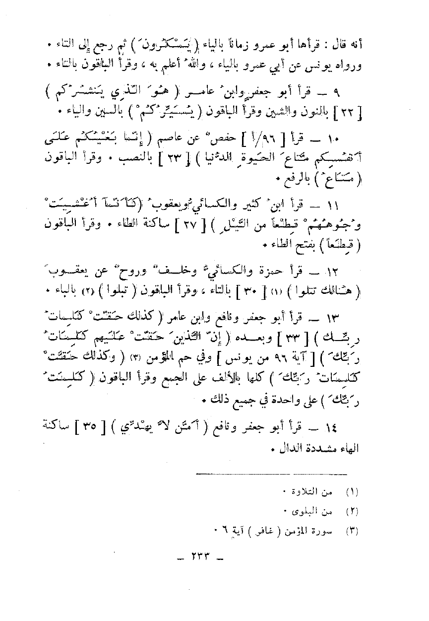 13 - قرأ أبو جعفر ونافع وابن عامر {كَذَلِكَ حَقَّتْ كَلِمَتُ رَبِّكَ} [33] وبعده {إِنَّ الَّذِينَ حَقَّتْ عَلَيْهِمْ كَلِمَتُ رَبِّكَ} [آية 96 من يونس] وفي حم المؤمن {كَذَلِكَ حَقَّتْ كَلِمَتُ رَبِّكَ} كلها بالألف على الجمع وقرأ الباقون {كَلِمَتُ رَبِّكَ} على واحدة في جميع ذلك.
