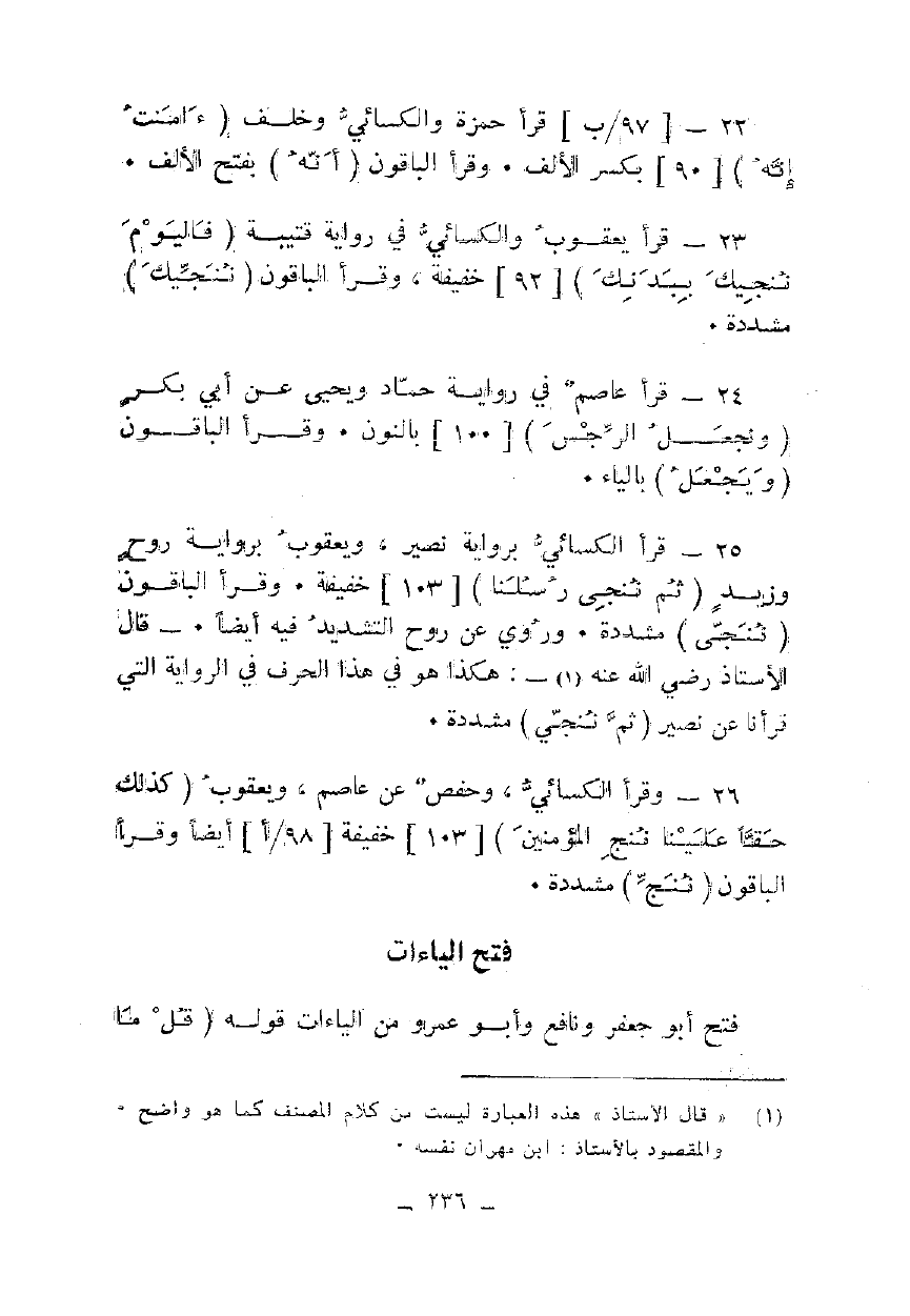 25 - قرأ الكسائي برواية نصير، ويعقوب برواية روح وزيد {ثُمَّ نُنَجِّي رُسُلَنَا} [103] خفيفة. وقرأ الباقون {نُنَجِّي} مشددة. وروي عن روح التشديد فيه أيضا. - قال الأستاذ رضي الله عنه -: هكذا هو في هذا الحرف في الرواية التي قرأنا عن نصير {ثُمَّ نُنَجِّي} مشددة.