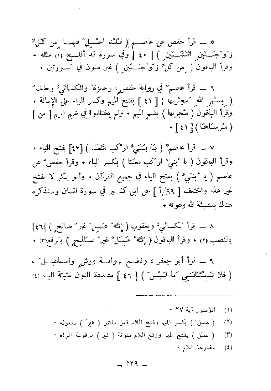 5 - قرأ حفص عن عاصم {قُلْنَا احْمِلْ فِيهَا مِنْ كُلٍّ زَوْجَيْنِ اثْنَيْنِ} [40] وفي سورة قد أفلح مثله. وقرأ الباقون {مِنْ كُلٍّ زَوْجَيْنِ} غير منون في السورتين.