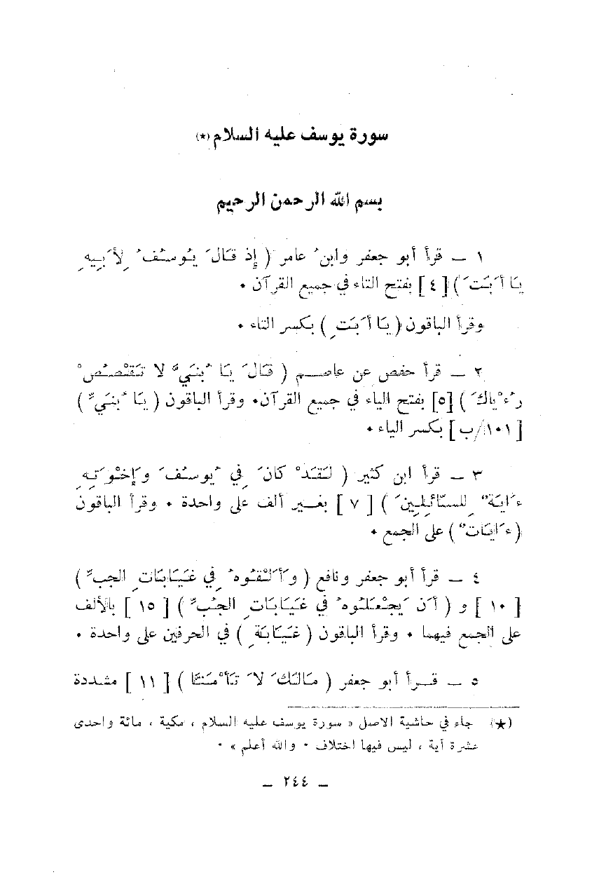 1 - قرأ أبو جعفر وابن عامر {إِذْ قَالَ يُوسُفُ لِأَبِيهِ يَا أَبَتِ} [4] بفتح التاء في جميع القرآن.