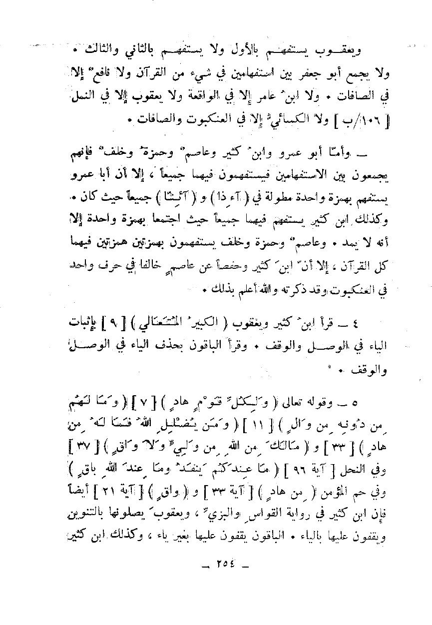 5 - وقوله تعالى {وَلِكُلِّ قَوْمٍ هَادٍ} [7] {وَمَا لَهُمْ مِنْ دُونِهِ مِنْ وَالٍ} [11] {وَمَنْ يُضْلِلِ اللَّهُ فَمَا لَهُ مِنْ هَادٍ} [33] و {مَا لَكَ مِنَ اللَّهِ مِنْ وَلِيٍّ وَلَا وَاقٍ} [37] وفي النحل [آية 96] {مَا عِنْدَكُمْ يَنْفَدُ وَمَا عِنْدَ اللَّهِ بَاقٍ} وفي حم المؤمن {مِنْ هَادٍ} [آية 33] و {وَاقٍ} [آية 21] أيضا فإن ابن كثير في رواية القواس والبزي، ويعقوب يصلونها بالتنوين ويقفون عليها بالياء. الباقون يقفون عليها بغير ياء، وكذلك ابن كثير