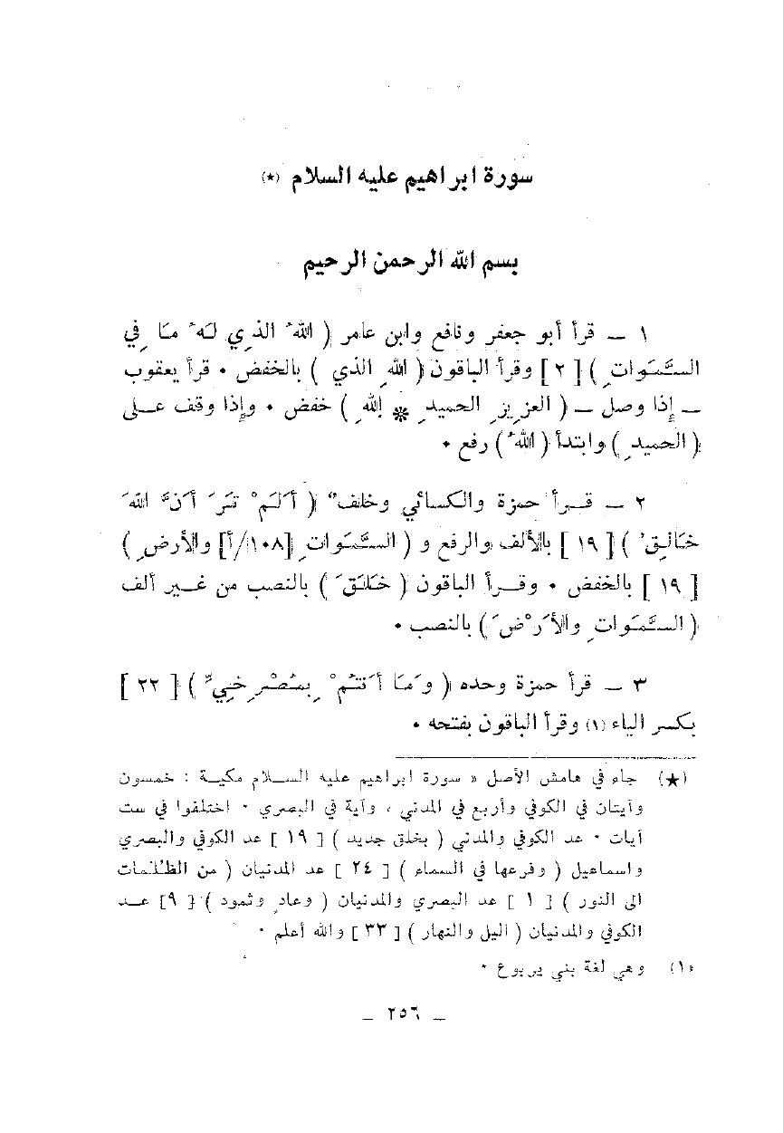 1 - قرأ أبو جعفر ونافع وابن عامر {اللَّهِ الَّذِي لَهُ مَا فِي السَّمَاوَاتِ} [2] وقرأ الباقون {اللَّهِ الَّذِي} بالخفض. قرأ يعقوب - إذا وصل - {الْعَزِيزِ الْحَمِيدِ (1) اللَّهِ} خفض. وإذا وقف على {الْحَمِيدِ} وابتدأ {اللَّهِ} رفع.